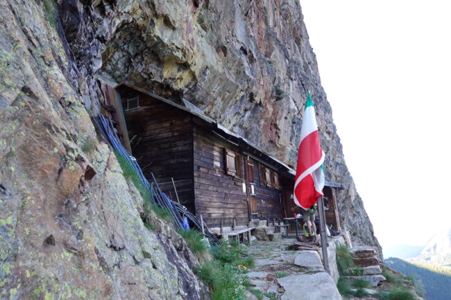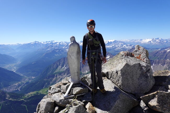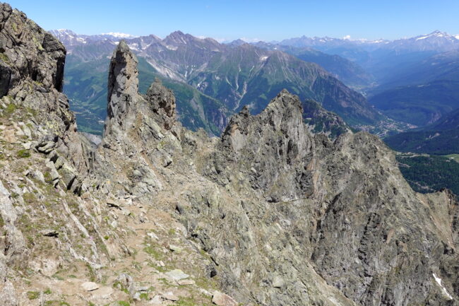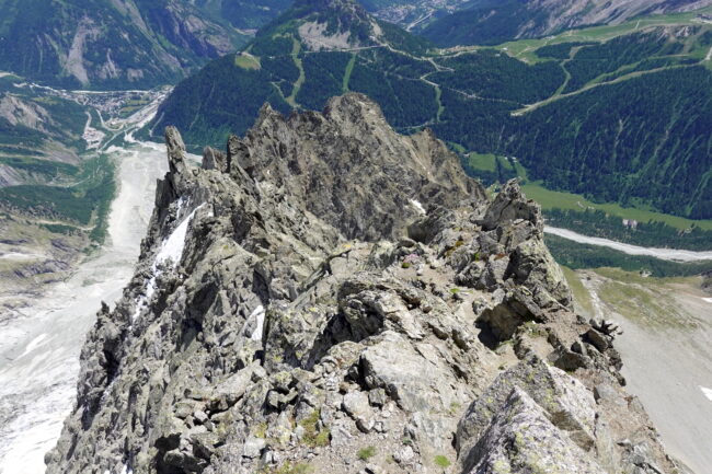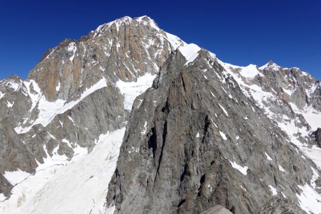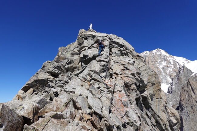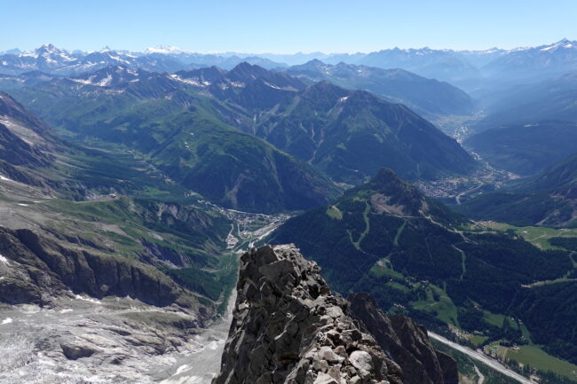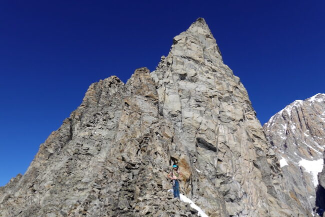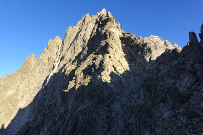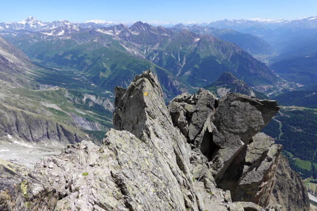 L’Aiguille Noire de Peuterey appartient au massif du Mont-Blanc & domine le val Vény. Depuis Courmayeur, sa silhouette s’avère particulièrement impressionnante. La cime constitue la première étape de l’arête intégrale de Peuterey, l’un des itinéraires les plus réputés pour atteindre le toit des Alpes. Il est possible de gravir uniquement le sommet en question, par l’arête sud ou par l’arête est. Cette dernière constitue la voie normale de la montagne, souvent empruntée comme voie de descente de l’arête sud. Balisée par de nombreux points jaunes & par des cairns, c’est un itinéraire peu difficile techniquement mais très exposé. La veille, il est possible de dormir au bivouac Borelli, accessible après une approche mêlant marche & via ferrata.