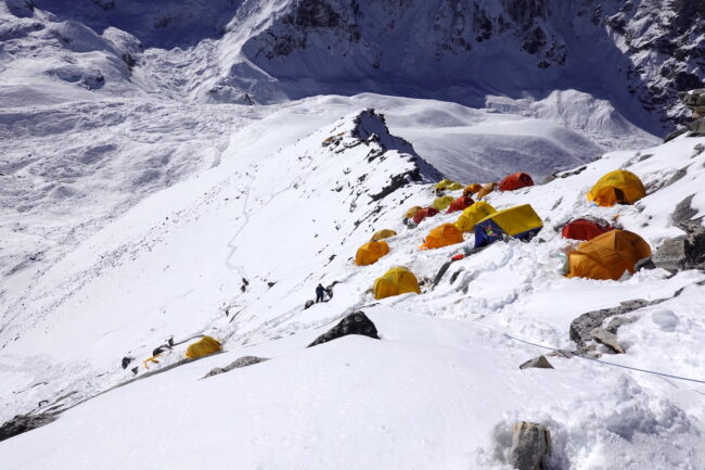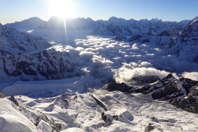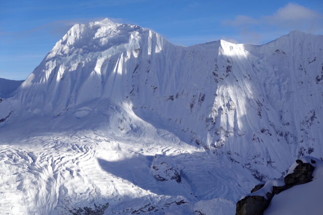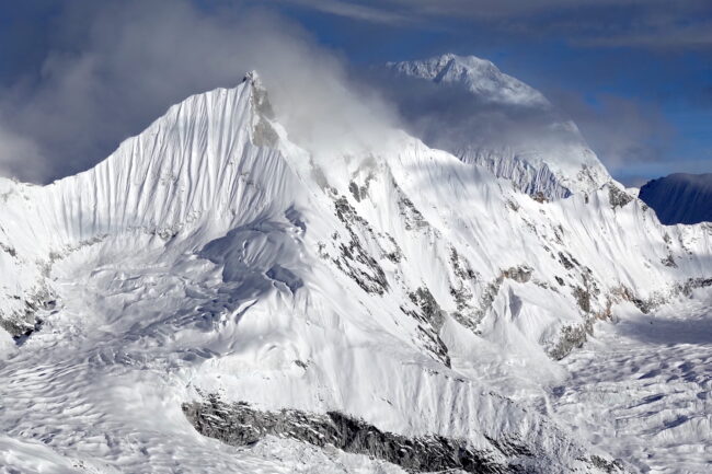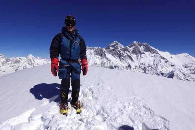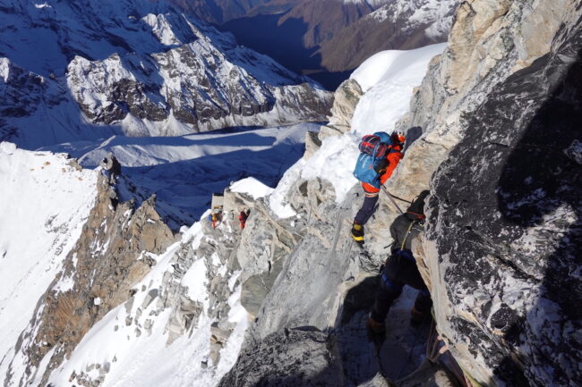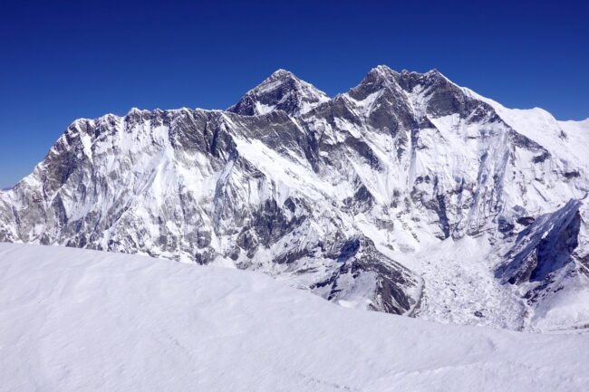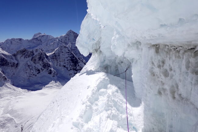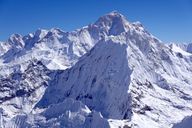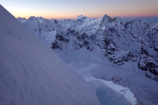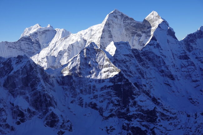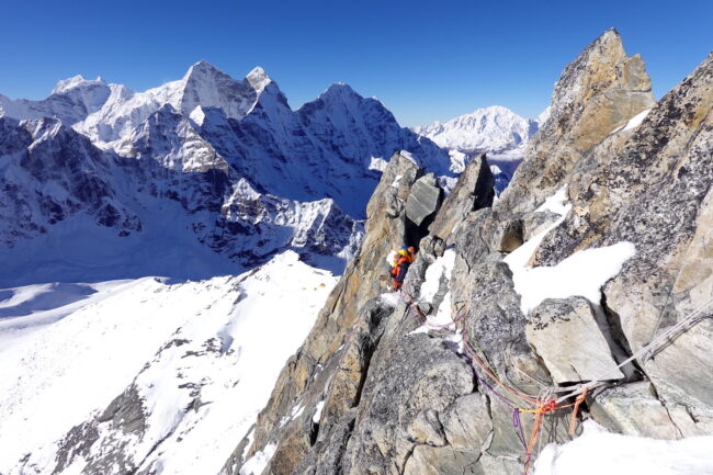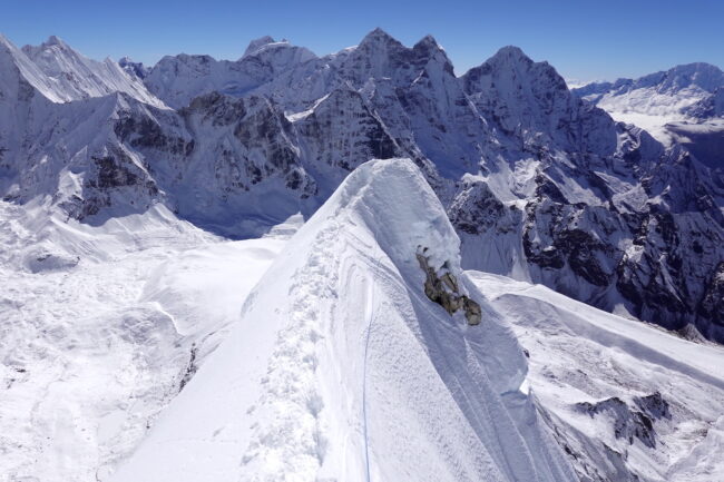 L’Ama Dablam est souvent considéré comme l’un des plus beaux sommets de la planète. Appartenant à l’Himalaya népalais, il trône dans la vallée du Khumbu & est situé dans le parc national de Sargamatha. La montagne est dominée de près par l’Everest, le Lhotse & le Makalu; respectivement le premier, quatrième & cinquième plus hauts reliefs du monde. Son esthétisme & son altitude frôlant les 7000 mètres en font une destination prisée des expéditions commerciales. La voie classique d’ascension suit son arête sud-ouest, équipée de cordes fixes durant le printemps & l’automne. L’itinéraire possède un camp de base & trois camps d’altitude; situés à 4600, 5700, 6050 & 6300 mètres. Le camp de base est accessible après 3 ou 4 jours de marche, depuis le village de Lukla. Les difficultés techniques de l’Ama Dablam débutent au dessus du camp 1, proposant des sections rocheuses & mixtes très abruptes. Parmi elles, les plus notables se trouvent au niveau de la Yellow Tower & du Grey Couloir. S’en suit le passage de la Mushroom Ridge, une arête neigeuse très effilée donnant accès au dernier camp. En amont, les pentes sommitales glaciaires s’avèrent extrêmement raides & exposées. La descente, périlleuse & difficile, emprunte le même tracé & nécessite de nombreux rappels.