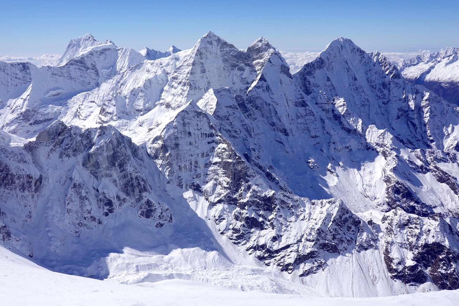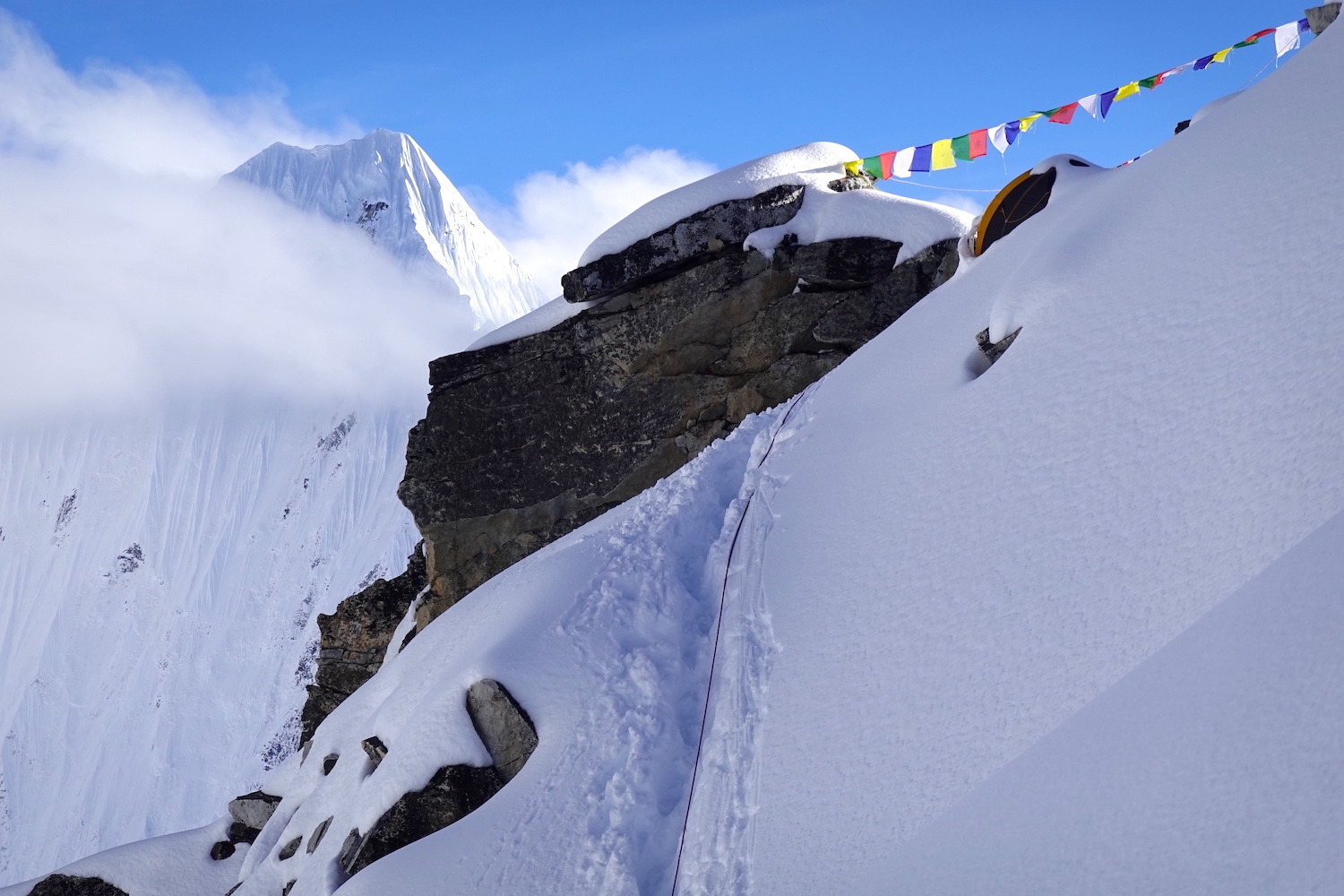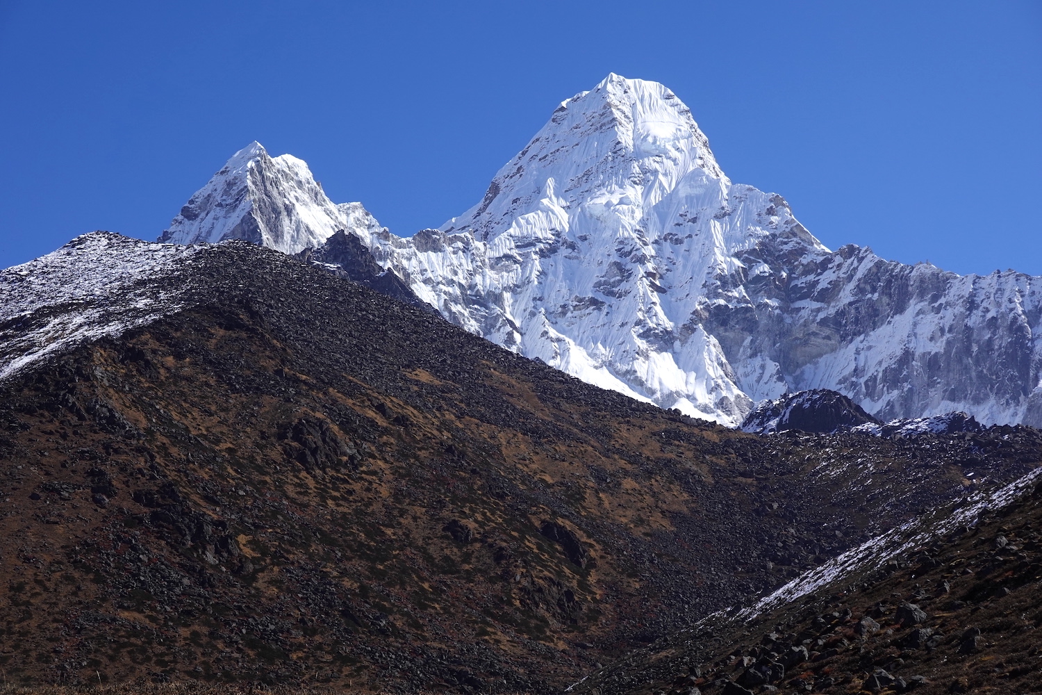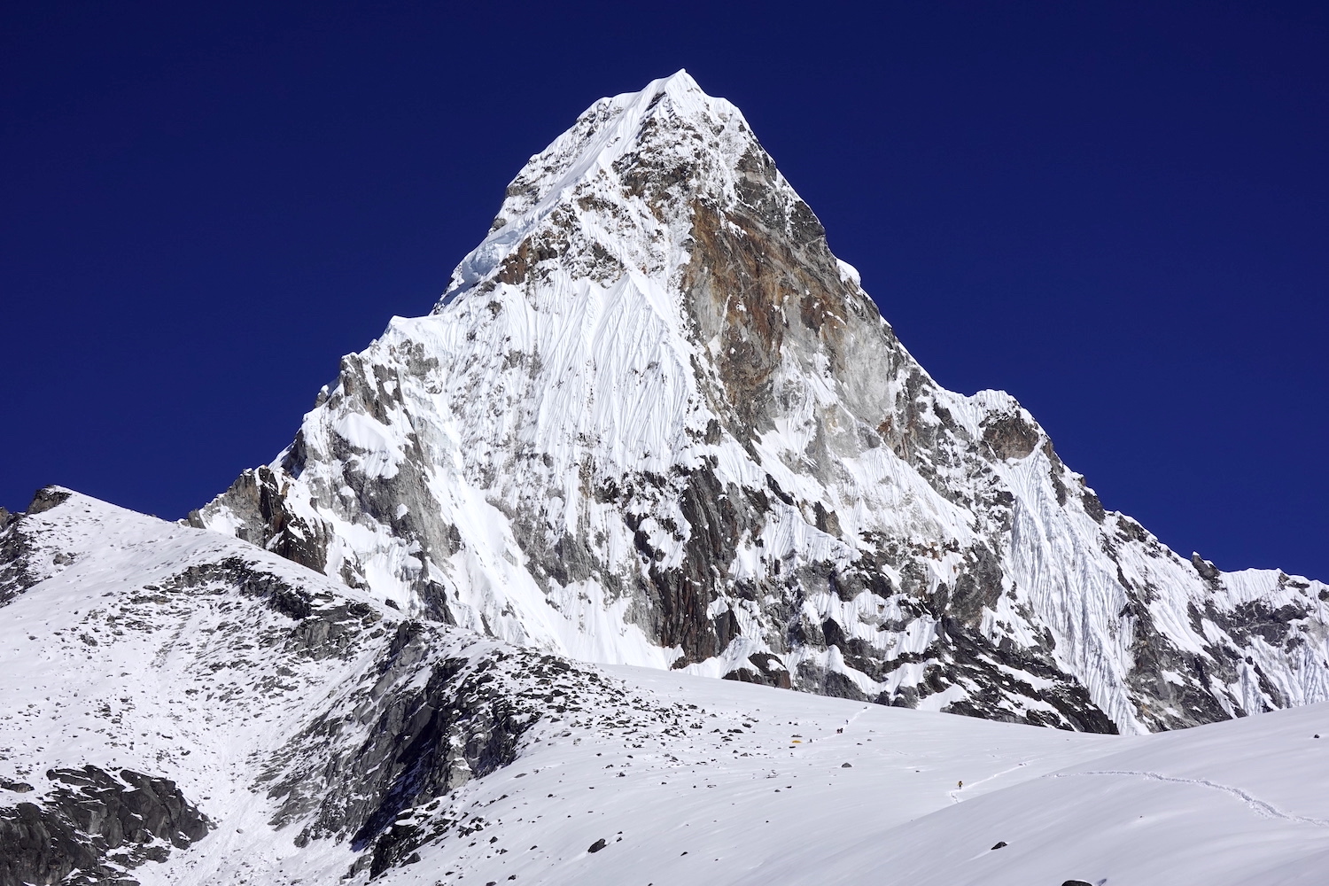 L’Ama Dablam est souvent considéré comme l’un des plus beaux sommets de la planète. Appartenant à l’Himalaya népalais, il trône dans la vallée du Khumbu & est situé dans le parc national de Sargamatha. La montagne est dominée de près par l’Everest, le Lhotse & le Makalu; respectivement le premier, quatrième & cinquième plus hauts reliefs du monde. Son esthétisme & son altitude frôlant les 7000 mètres en font une destination prisée des expéditions commerciales. La voie classique d’ascension suit son arête sud-ouest, équipée de cordes fixes durant le printemps & l’automne. L’itinéraire possède un camp de base & trois camps d’altitude; situés à 4600, 5700, 6050 & 6300 mètres. Le camp de base est accessible après 3 ou 4 jours de marche, depuis le village de Lukla. Les difficultés techniques de l’Ama Dablam débutent au dessus du camp 1, proposant des sections rocheuses & mixtes très abruptes. Parmi elles, les plus notables se trouvent au niveau de la Yellow Tower & du Grey Couloir. S’en suit le passage de la Mushroom Ridge, une arête neigeuse très effilée donnant accès au dernier camp. En amont, les pentes sommitales glaciaires s’avèrent extrêmement raides & exposées. La descente, périlleuse & difficile, emprunte le même tracé & nécessite de nombreux rappels.