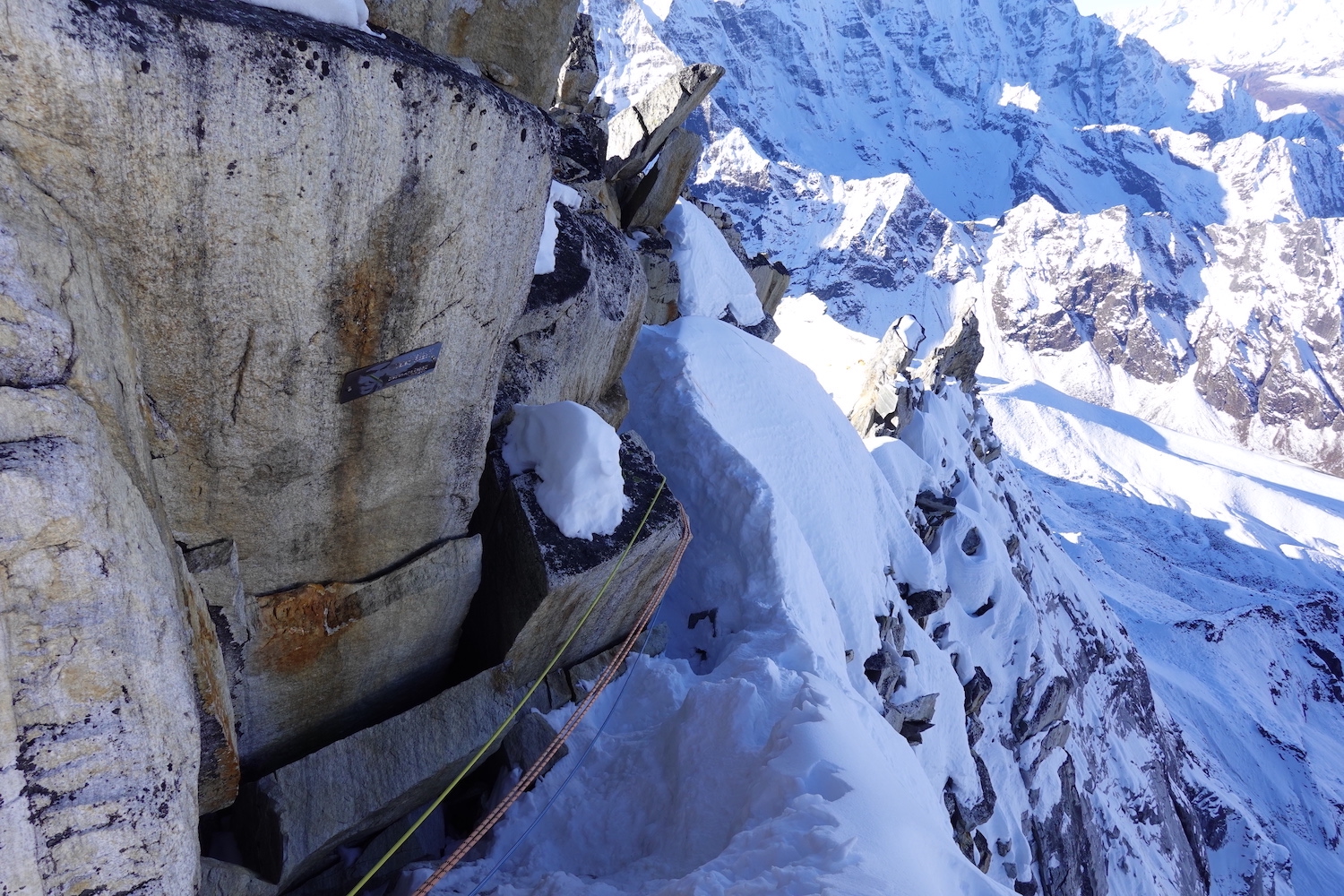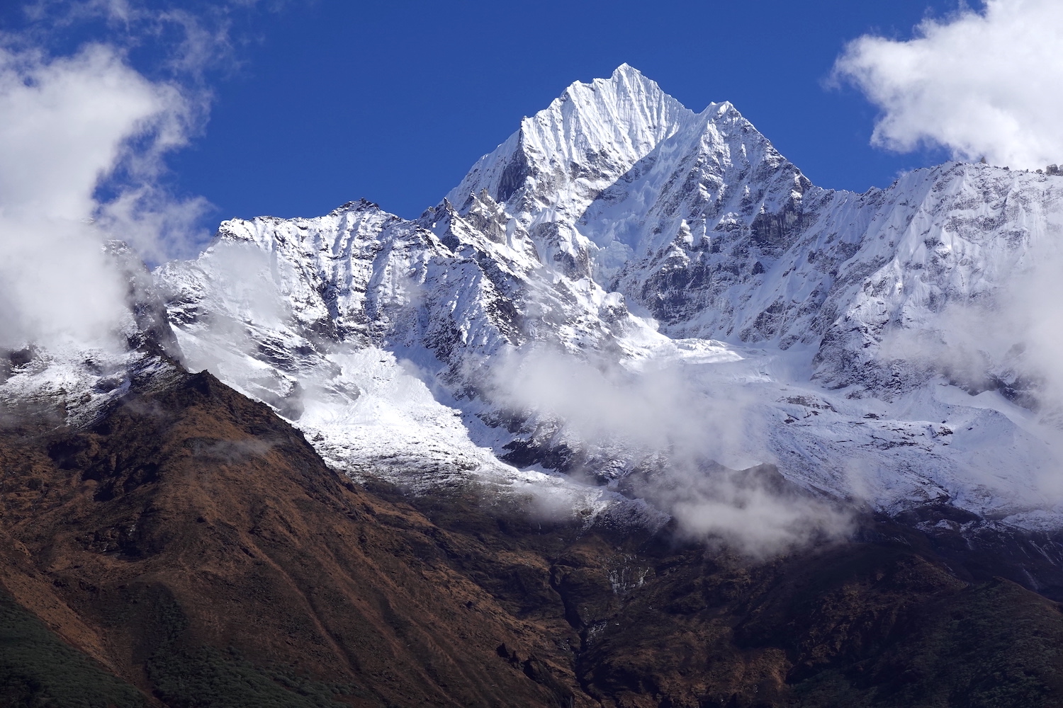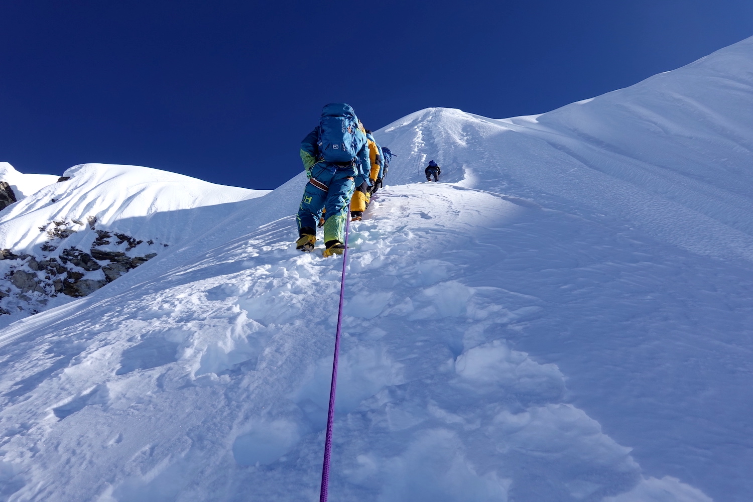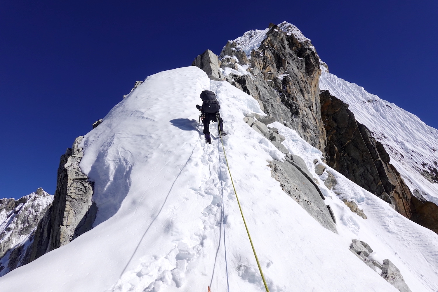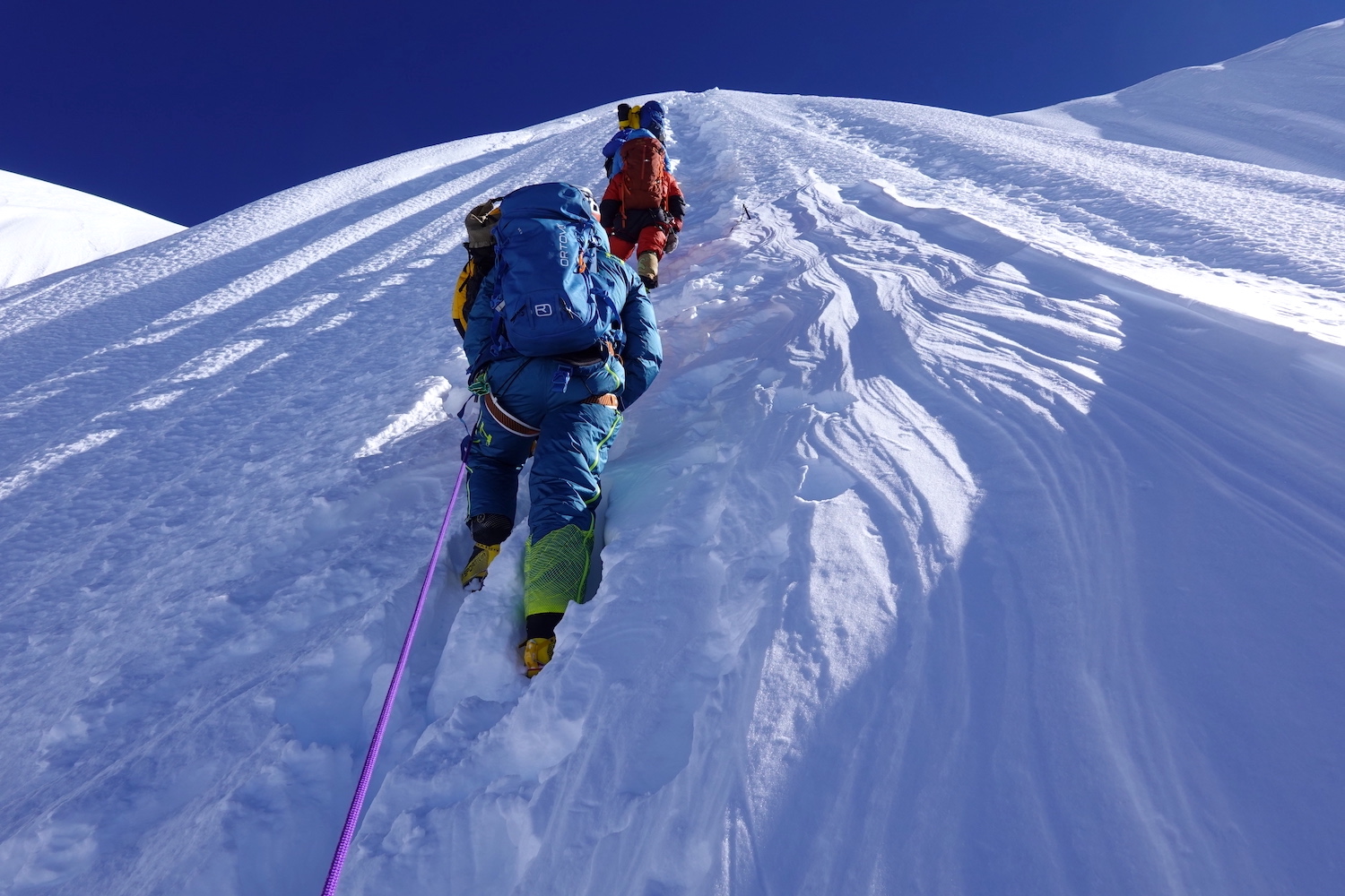 L’Ama Dablam est souvent considéré comme l’un des plus beaux sommets de la planète. Appartenant à l’Himalaya népalais, il trône dans la vallée du Khumbu & est situé dans le parc national de Sargamatha. La montagne est dominée de près par l’Everest, le Lhotse & le Makalu; respectivement le premier, quatrième & cinquième plus hauts reliefs du monde. Son esthétisme & son altitude frôlant les 7000 mètres en font une destination prisée des expéditions commerciales. La voie classique d’ascension suit son arête sud-ouest, équipée de cordes fixes durant le printemps & l’automne. L’itinéraire possède un camp de base & trois camps d’altitude; situés à 4600, 5700, 6050 & 6300 mètres. Le camp de base est accessible après 3 ou 4 jours de marche, depuis le village de Lukla. Les difficultés techniques de l’Ama Dablam débutent au dessus du camp 1, proposant des sections rocheuses & mixtes très abruptes. Parmi elles, les plus notables se trouvent au niveau de la Yellow Tower & du Grey Couloir. S’en suit le passage de la Mushroom Ridge, une arête neigeuse très effilée donnant accès au dernier camp. En amont, les pentes sommitales glaciaires s’avèrent extrêmement raides & exposées. La descente, périlleuse & difficile, emprunte le même tracé & nécessite de nombreux rappels.