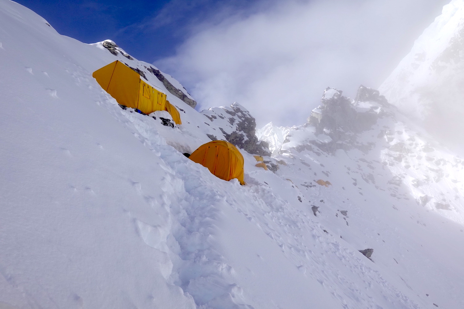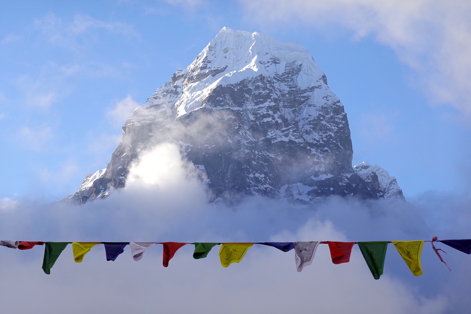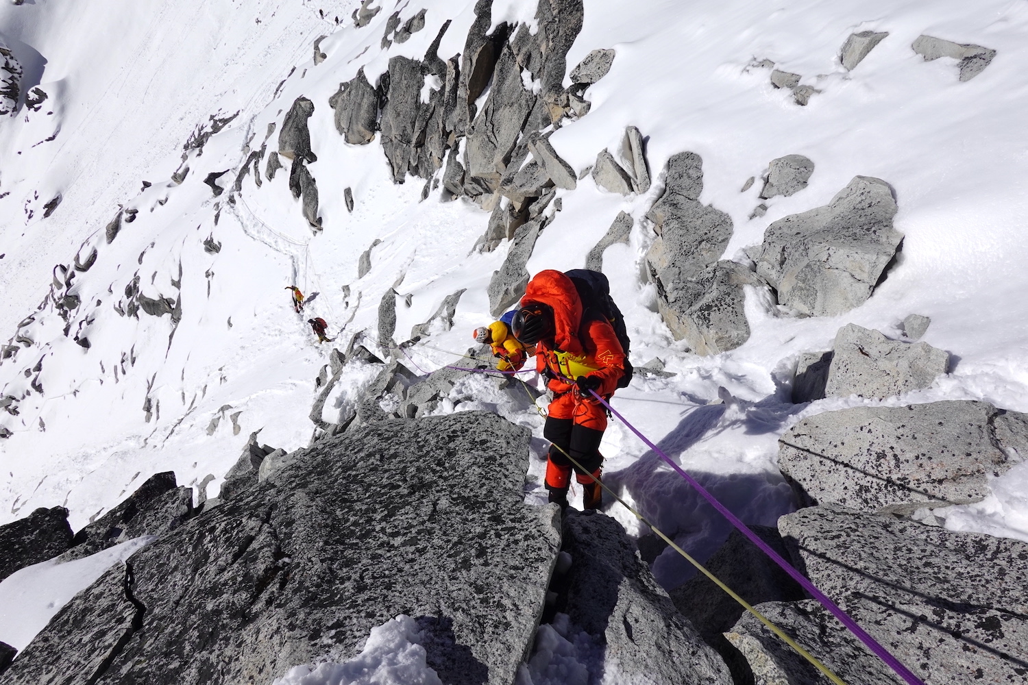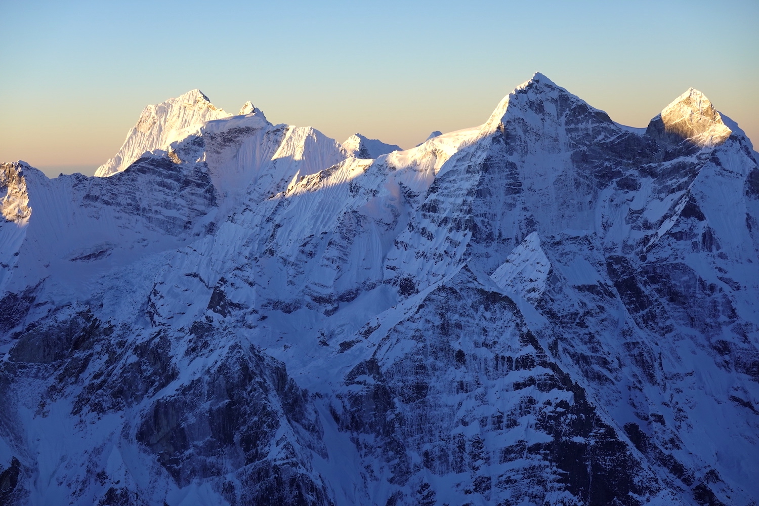 L’Ama Dablam est souvent considéré comme l’un des plus beaux sommets de la planète. Appartenant à l’Himalaya népalais, il trône dans la vallée du Khumbu & est situé dans le parc national de Sargamatha. La montagne est dominée de près par l’Everest, le Lhotse & le Makalu; respectivement le premier, quatrième & cinquième plus hauts reliefs du monde. Son esthétisme & son altitude frôlant les 7000 mètres en font une destination prisée des expéditions commerciales. La voie classique d’ascension suit son arête sud-ouest, équipée de cordes fixes durant le printemps & l’automne. L’itinéraire possède un camp de base & trois camps d’altitude; situés à 4600, 5700, 6050 & 6300 mètres. Le camp de base est accessible après 3 ou 4 jours de marche, depuis le village de Lukla. Les difficultés techniques de l’Ama Dablam débutent au dessus du camp 1, proposant des sections rocheuses & mixtes très abruptes. Parmi elles, les plus notables se trouvent au niveau de la Yellow Tower & du Grey Couloir. S’en suit le passage de la Mushroom Ridge, une arête neigeuse très effilée donnant accès au dernier camp. En amont, les pentes sommitales glaciaires s’avèrent extrêmement raides & exposées. La descente, périlleuse & difficile, emprunte le même tracé & nécessite de nombreux rappels.