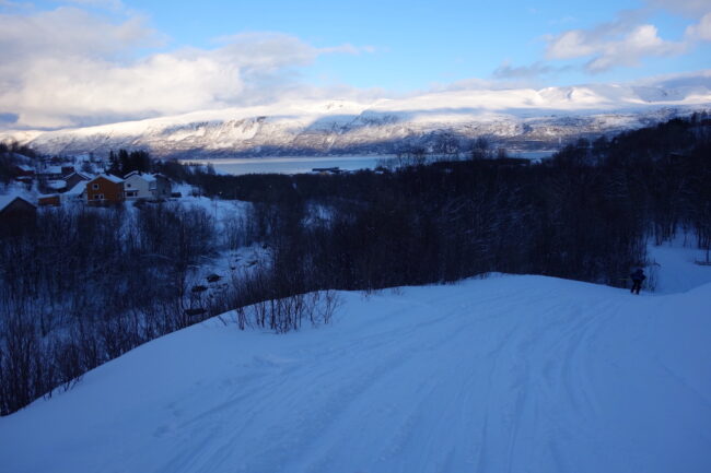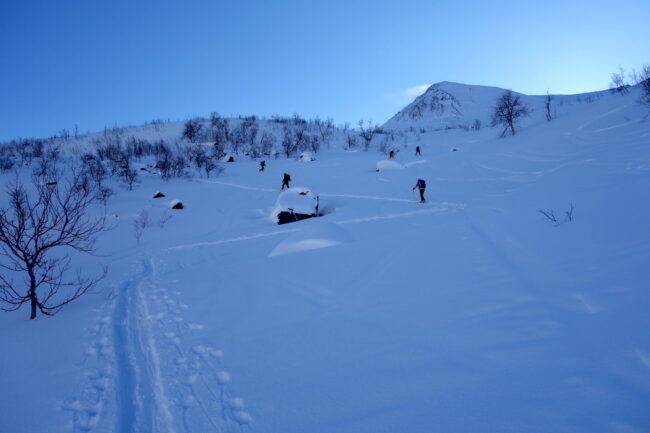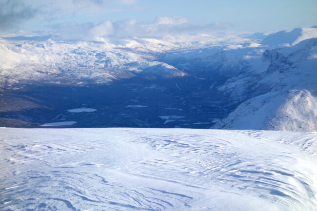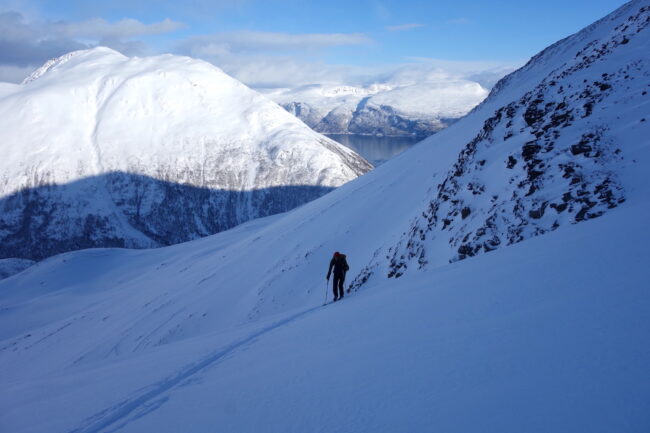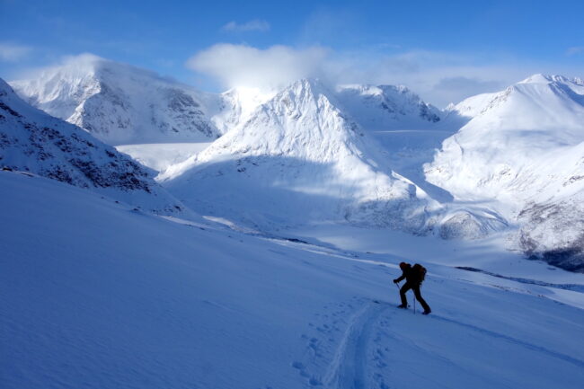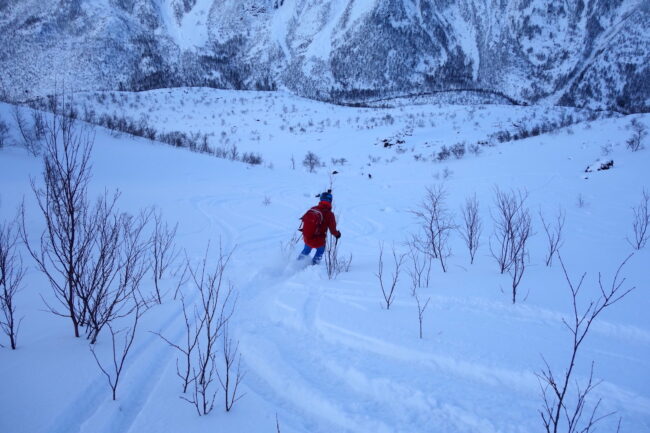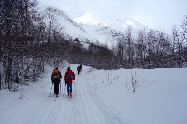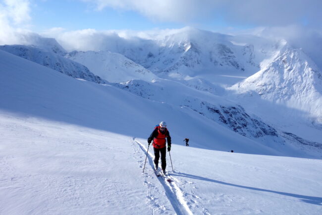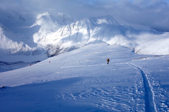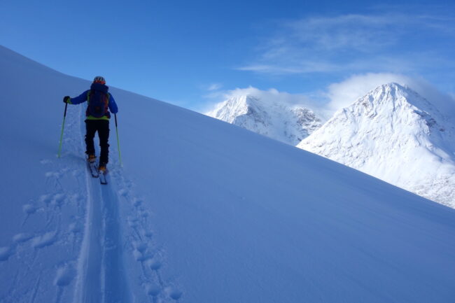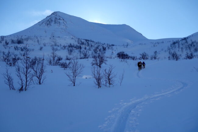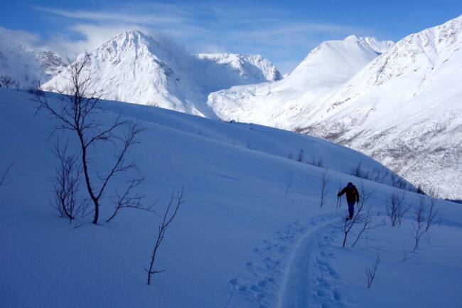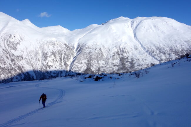 Le Daltinden représente l’un des plus hauts sommets des Alpes de Lyngen, avec une altitude dépassant les 1500 mètres. Sa face nord accueille l’itinéraire le plus fréquenté. L’approche de ce dernier consiste à s’élever doucement dans la vallée de Lyngsdalselva, sur quelques kilomètres. Celle-ci permet ensuite de rejoindre la voie en tant que telle, menant les skieurs naturellement sur le vaste plateau sommital. Tout au long de l’ascension, les paysages environnants sont très esthétiques. Parmi eux, les glaciers du Jiekkevarri, point culminant des Alpes de Lyngen, sont mis en évidence. Le parcours, proposant des pentes idéales pour la glisse, est devenu un classique du coin. Le dénivelé & la distance à réaliser ne sont pas négligeables.