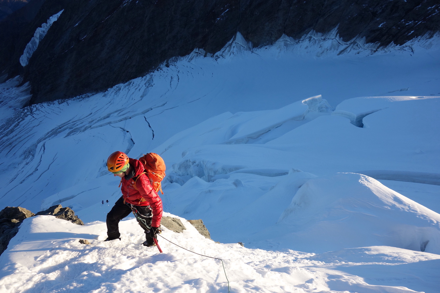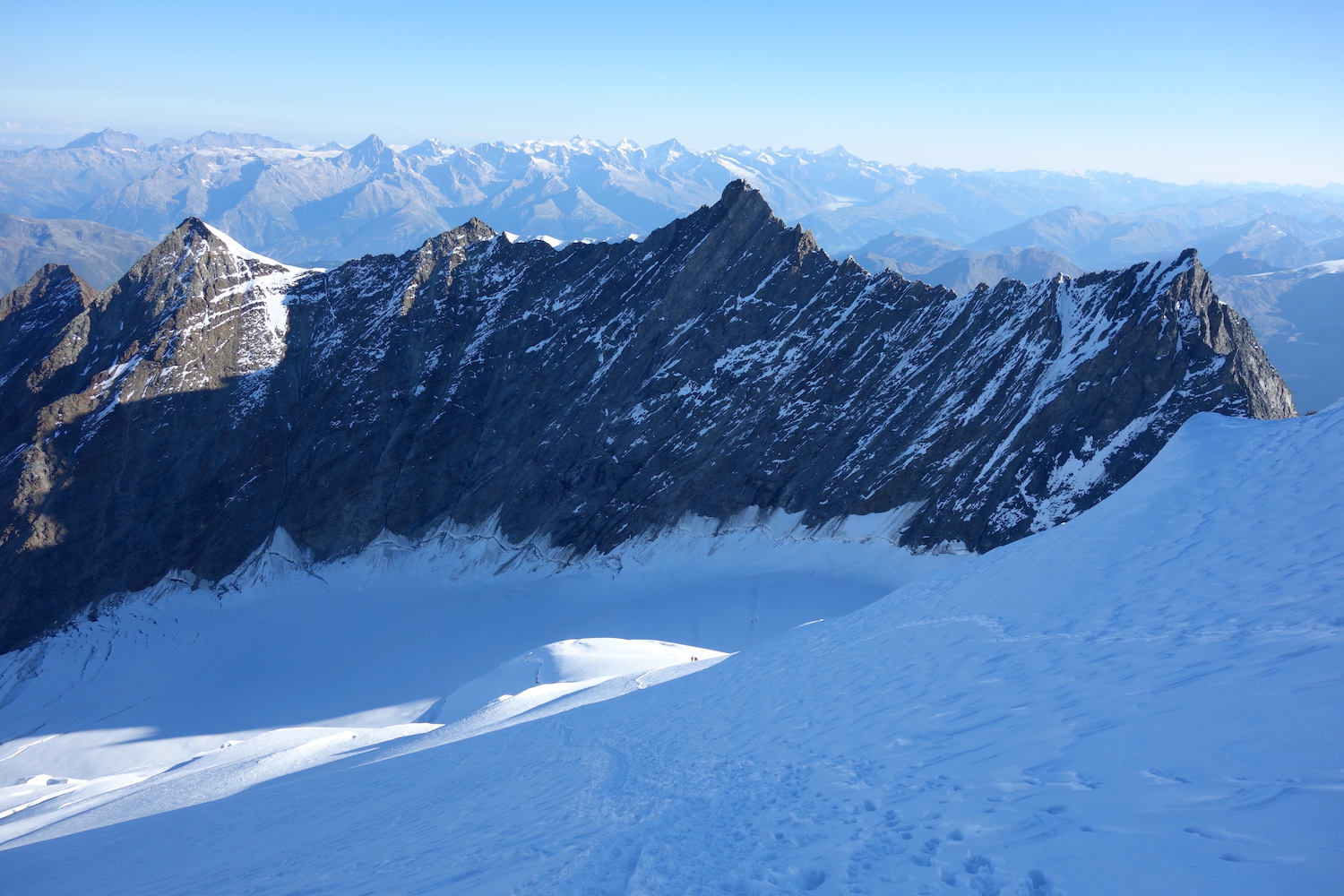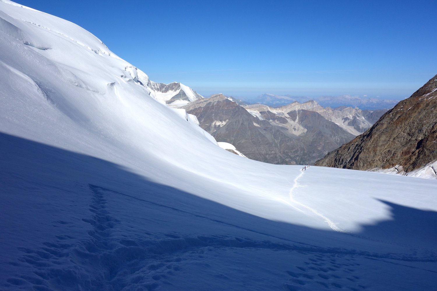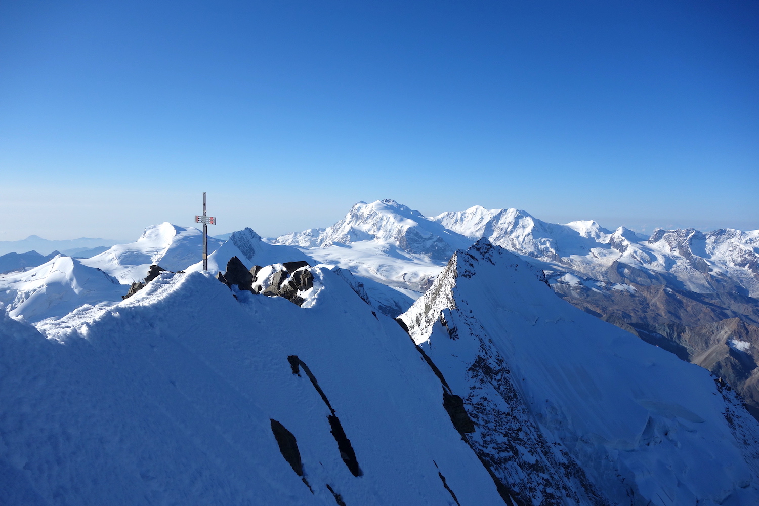 Le Dom des Mischabels, ou simplement Dom, est le plus haut sommet entièrement situé en Suisse. Perché entre le Mattertal & le Saastal, il constitue également le point culminant de la chaine des Mischabels. Son versant nord glaciaire se démarque radicalement de sa face sud, rocheuse & abrupte. La voie normale du géant, réalisable à pied comme à ski, représente l’un des dénivelés absolus les plus importants des Alpes. En effet, celle-ci se compose de 3150 mètres à la verticale & se dessine sur les flancs nord-ouest. La Festigrat en est une alternative intéressante, située à proximité. Il s’agit d’une arête mixte peu technique, permettant de toucher la croix sommitale de manière esthétique. Les deux itinéraires évoqués se séparent au niveau du Festijoch, passage obligatoire quelle que soit l’option choisie. Il est possible de couper l’ascension en deux jours, en dormant à la Domhütte, construite à 2940 mètres d’altitude.