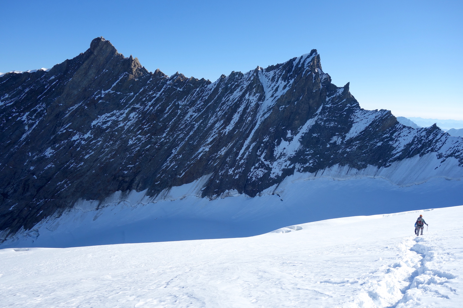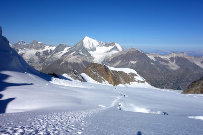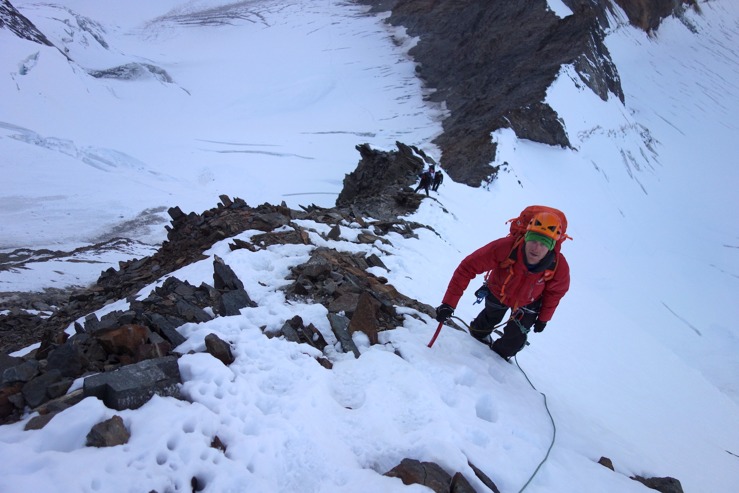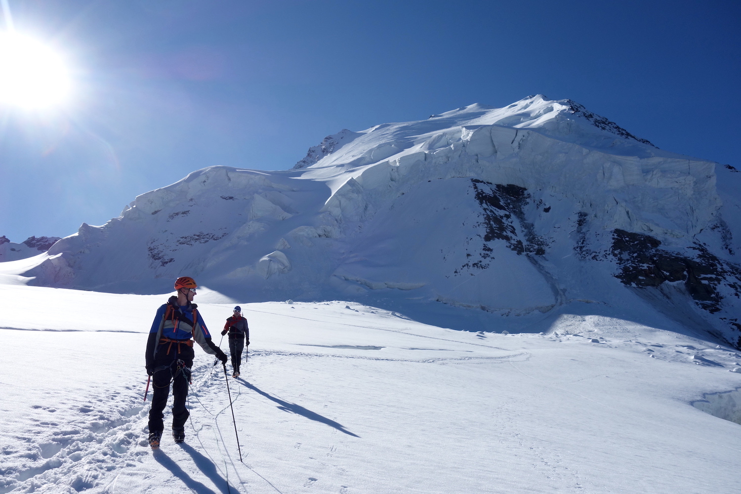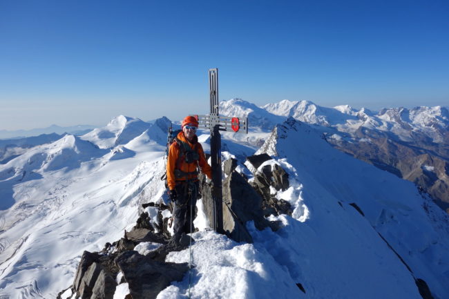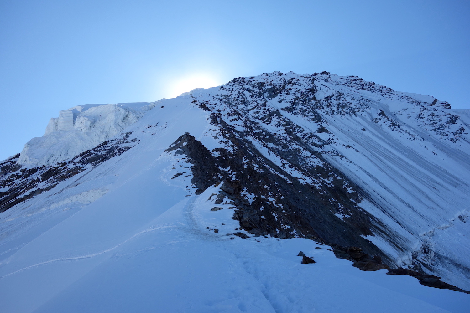 Le Dom des Mischabels, ou simplement Dom, est le plus haut sommet entièrement situé en Suisse. Perché entre le Mattertal & le Saastal, il constitue également le point culminant de la chaine des Mischabels. Son versant nord glaciaire se démarque radicalement de sa face sud, rocheuse & abrupte. La voie normale du géant, réalisable à pied comme à ski, représente l’un des dénivelés absolus les plus importants des Alpes. En effet, celle-ci se compose de 3150 mètres à la verticale & se dessine sur les flancs nord-ouest. La Festigrat en est une alternative intéressante, située à proximité. Il s’agit d’une arête mixte peu technique, permettant de toucher la croix sommitale de manière esthétique. Les deux itinéraires évoqués se séparent au niveau du Festijoch, passage obligatoire quelle que soit l’option choisie. Il est possible de couper l’ascension en deux jours, en dormant à la Domhütte, construite à 2940 mètres d’altitude.