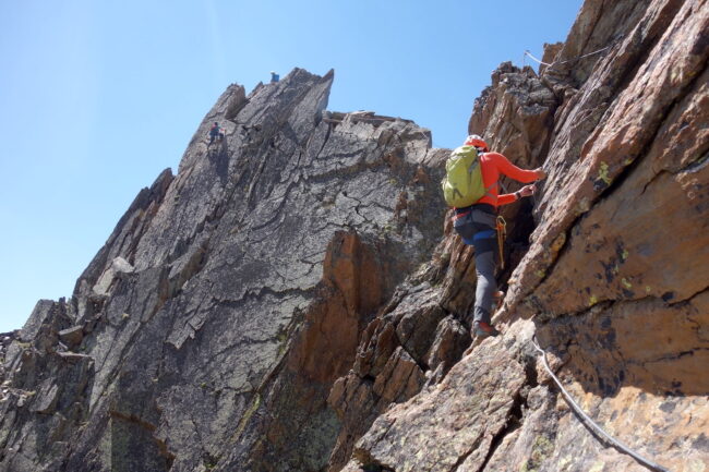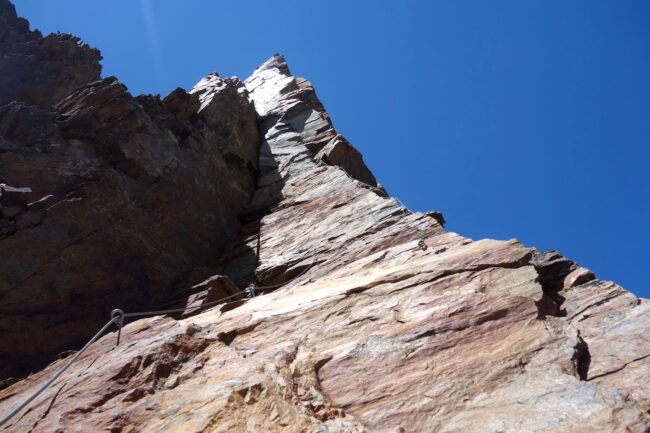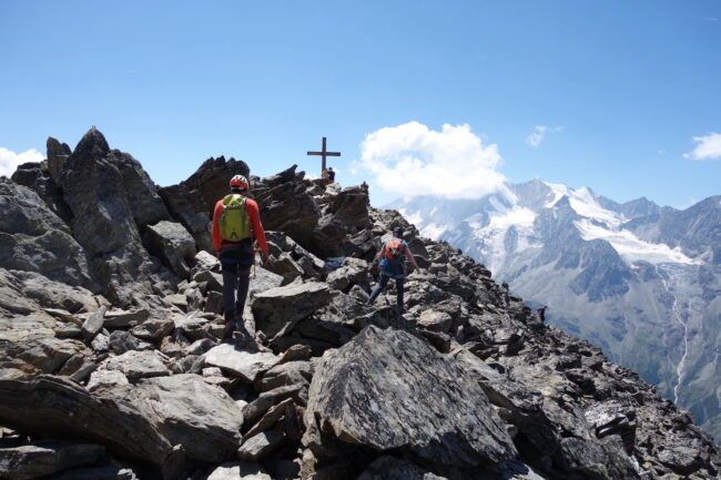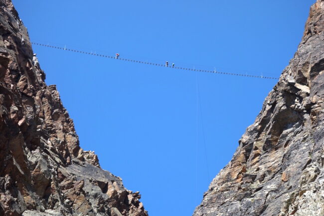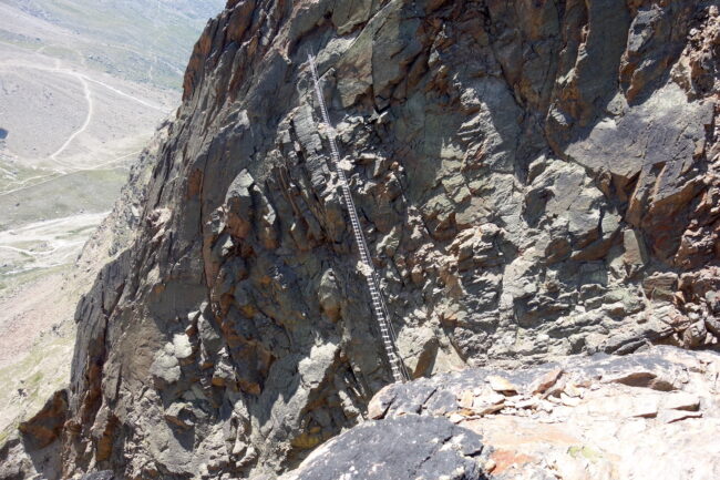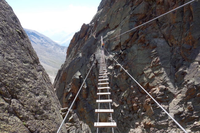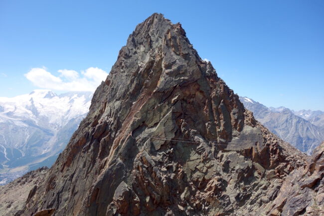 Le Jegihorn est une cime trônant dans la vallée de Saas, dominée de près par le trio Fletschhorn-Lagginhorn-Weissmies. Elle a la particularité d’accueillir la plus haute via ferrata de Suisse & des Alpes occidentales. Ce parcours câblé emprunte successivement le versant méridional, avant d’aboutir à l’antécime nord-est de la montagne. À ce stade, une courte descente est nécessaire pour rejoindre l’immense pont népalais caractéristique. Il amène à l’ultime section du parcours, aérienne & physique. Les ferratistes arrivent ensuite au sommet du Jegihorn, décoré d’une croix. Le retour s’effectue par la voie normale, balisée. En général, la sortie s’écourte grâce aux remontées mécaniques de Saas-Grund, en s’arrêtant à l’alpage de Kreuzboden.