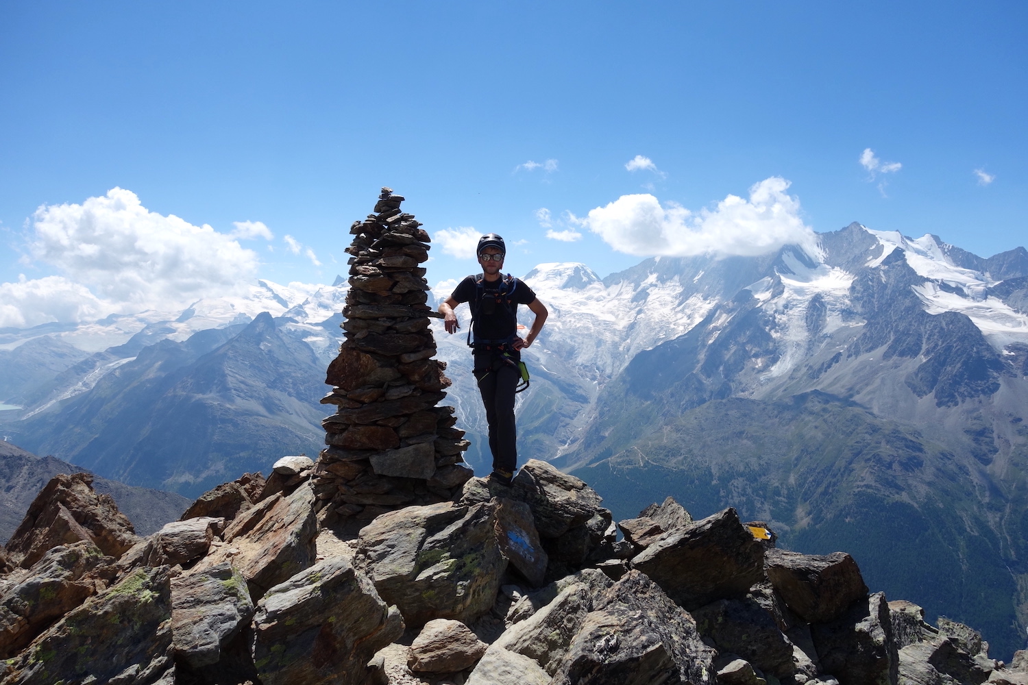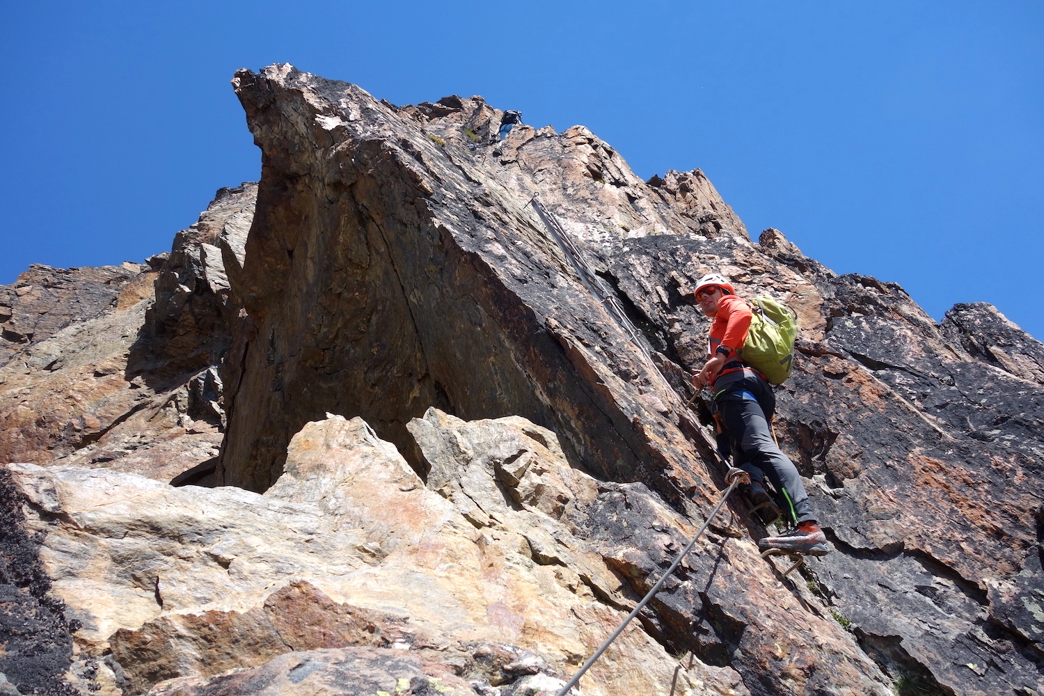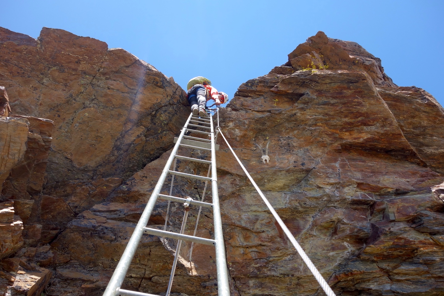 Le Jegihorn est une cime trônant dans la vallée de Saas, dominée de près par le trio Fletschhorn-Lagginhorn-Weissmies. Elle a la particularité d’accueillir la plus haute via ferrata de Suisse & des Alpes occidentales. Ce parcours câblé emprunte successivement le versant méridional, avant d’aboutir à l’antécime nord-est de la montagne. À ce stade, une courte descente est nécessaire pour rejoindre l’immense pont népalais caractéristique. Il amène à l’ultime section du parcours, aérienne & physique. Les ferratistes arrivent ensuite au sommet du Jegihorn, décoré d’une croix. Le retour s’effectue par la voie normale, balisée. En général, la sortie s’écourte grâce aux remontées mécaniques de Saas-Grund, en s’arrêtant à l’alpage de Kreuzboden.