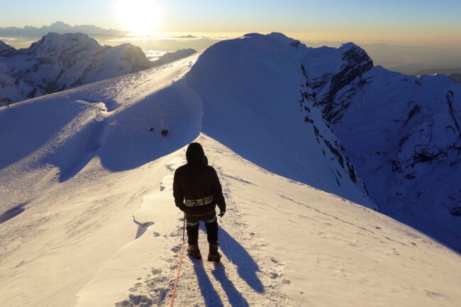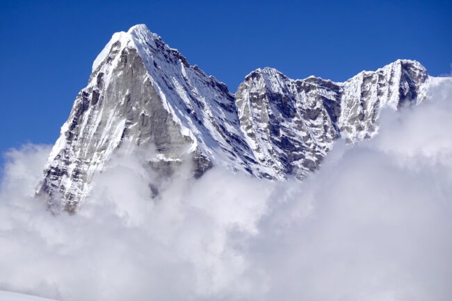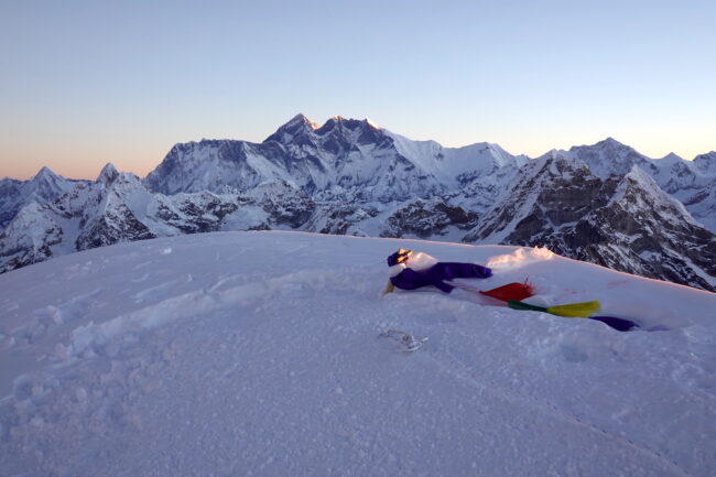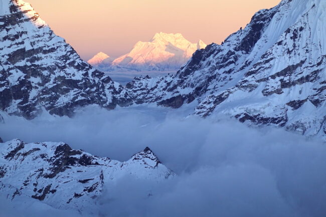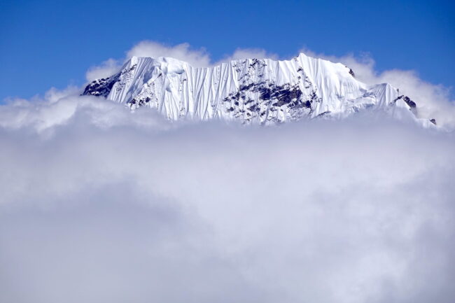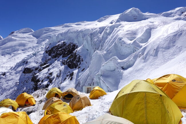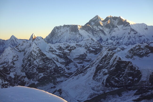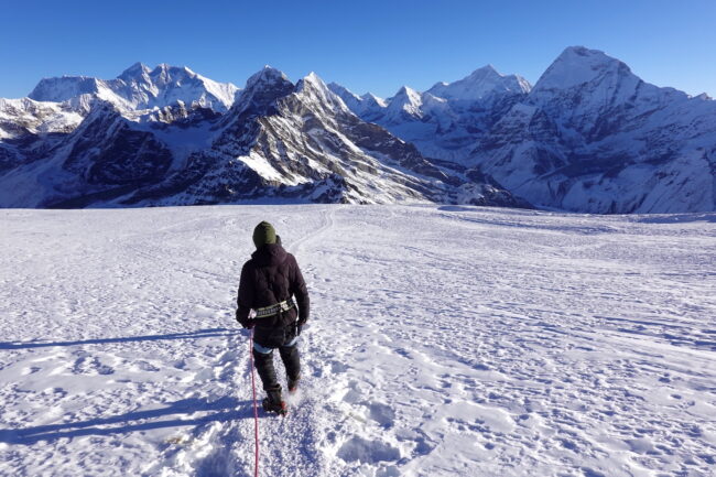 Le Mera Peak est situé dans l’Himalaya népalais & plus précisément dans le parc national de Makalu Barun. Celui-ci accueille des reliefs célèbres telles que le Chamlang, le Baruntse & le Makalu, cinquième plus haut sommet du monde. La montagne constitue le plus haut trekking peak du Népal & même de la planète. L’appellation trekking peak regroupe certaines cimes inférieures à 7000 mètres d’altitude, dépourvues de difficultés techniques. La voie normale du Mera Peak débute de Lukla, connu pour son aéroport très impressionnant. Ce dernier est accessible après 30 minutes de vol, depuis la capitale Katmandou. Notre itinéraire propose une marche d’approche d’environ 5 jours, permettant de découvrir plusieurs villages sherpas. Il s’agit d’un objectif à part entière ou d’un programme d’acclimatation intéressant, en cas de projets plus ambitieux. Du point culminant, la vue sur les géants himalayens s’avère spectaculaire.
