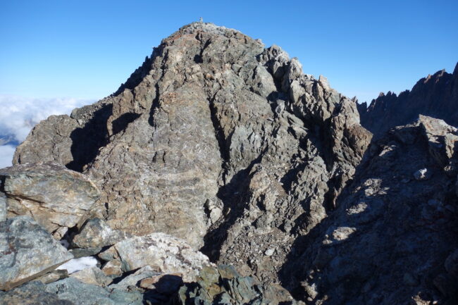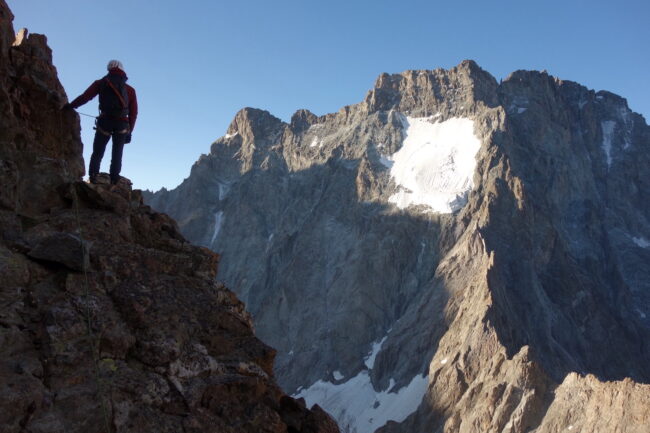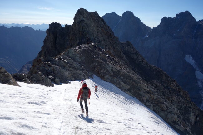 Le Pic Coolidge est la dixième plus haute montagne des Écrins, composée d’une antécime & d’un sommet principal. Jouissant d’une position géographique centrale, elle est réputée pour offrir l’un des plus beaux panoramas du massif. Pour atteindre son point culminant, la voie la moins technique est son arête sud. Elle démarre classiquement du hameau de la Bérarde, puis emprunte la vallée du Vénéon avant de s’élever jusqu’au refuge de Temple Écrins. De celui-ci, il est nécessaire de gagner le col de la Temple, avant de rejoindre l’itinéraire à proprement parlé. S’en suit une succession de vires, puis un court passage sur glacier avant de retrouver la roche. D’une telle altitude, il s’agit de l’une des cimes les plus accessibles de tout le massif.