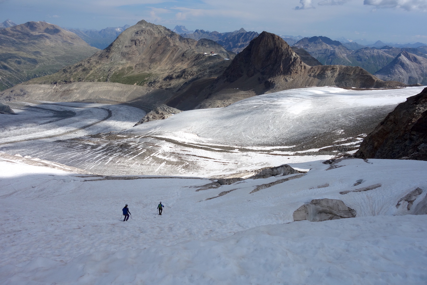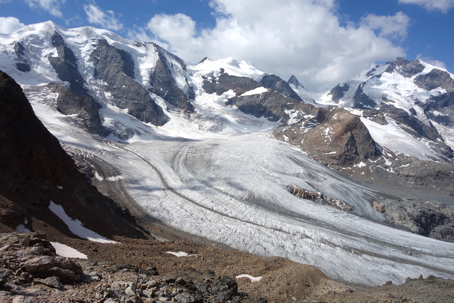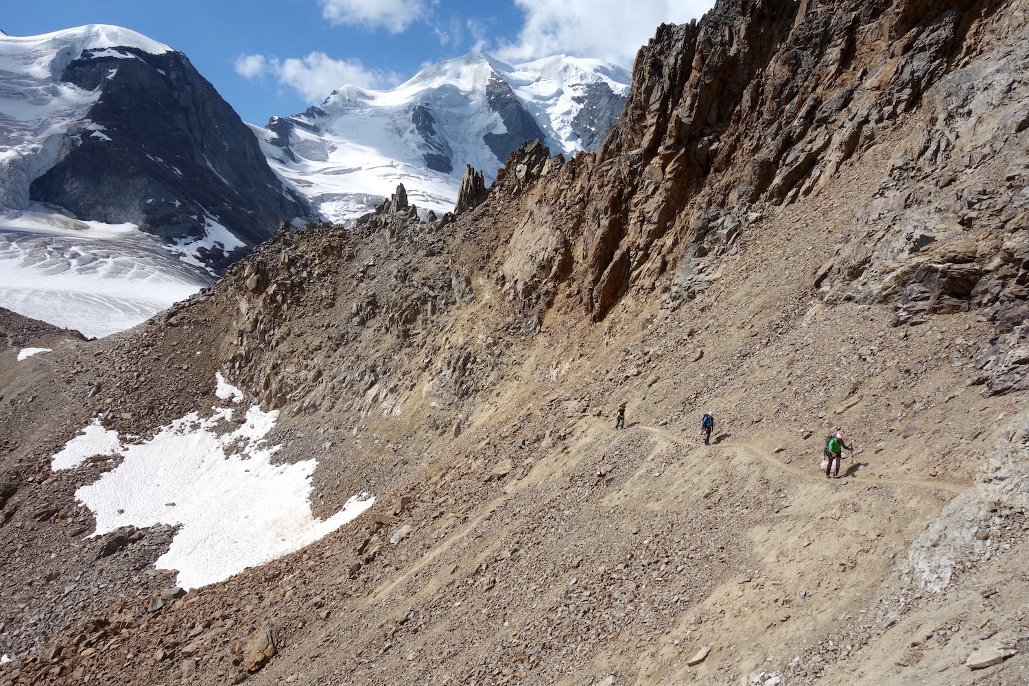 Les Piz Palü constituent un chainon montagneux du massif de la Bernina; composé du pic oriental, du pic principal & du Piz Spinas. Ils sont régulièrement fréquentés par les alpinistes revenant de la Biancograt, du Piz Bernina. L’enchainement consiste à dormir à la cabane Tschierva, puis d’emprunter l’itinéraire cité précédemment. La deuxième nuit se passe logiquement au refuge Marco e Rosa, avant de traverser les Piz Palü d’ouest en est. Cela permet de couper cette longue traversée en trois jours, en profitant de l’esthétisme des lieux par un magnifique parcours d’arêtes rocheuses & neigeuses. Afin de rendre la descente plus digeste, il est possible d’emprunter le téléphérique de la Diavolezza, construit à presque 3000 mètres d’altitude.