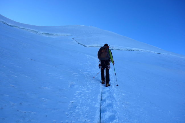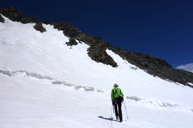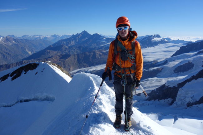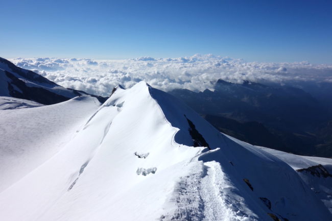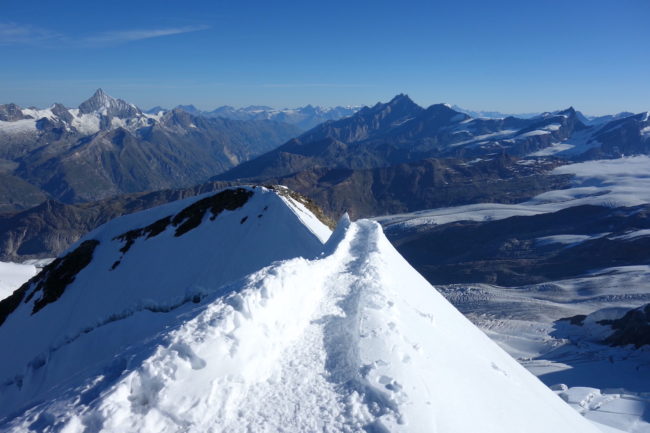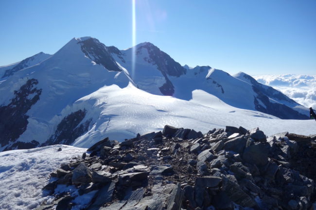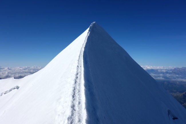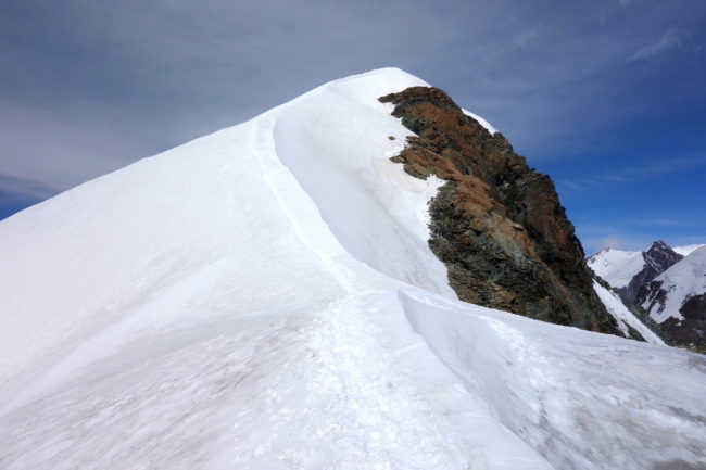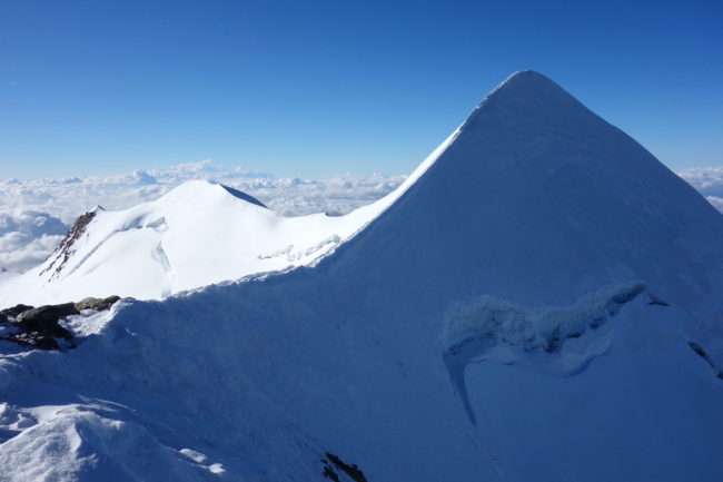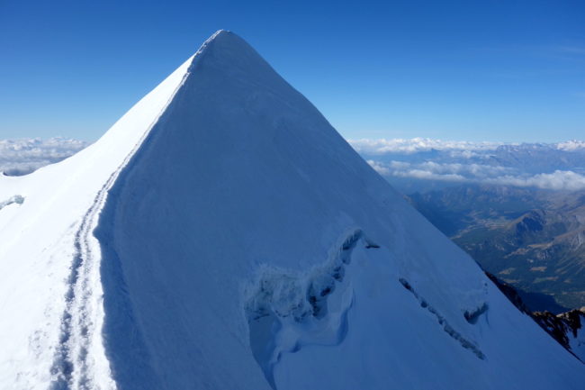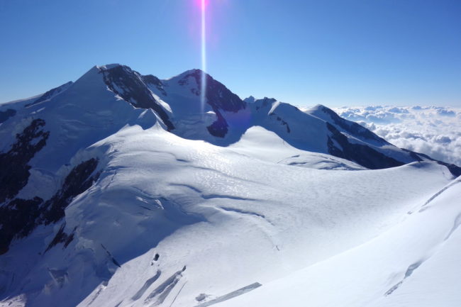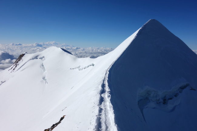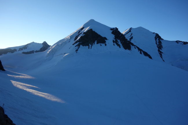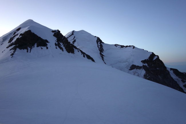 Le Castor est la seconde montagne du Mont Rose à porter le nom d’un Dioscure. Plus haute que son voisin le Pollux, elle est également plus populaire. Les deux reliefs sont séparés l’un de l’autre par le Zwillingsjoch, connu sous le nom de Passo di Verra en italien. Le Castor est moins exigeant sur le plan technique. Durant la Mezzalama (célèbre course de ski-alpinisme), les compétiteurs foulent parfois le point culminant en question, lorsque les conditions nivologiques & météorologiques sont optimales. Son versant nord-ouest est abordable & court à gravir. Entièrement glaciaire, il est souvent découpé par de grosses rimayes, surtout en fin de saison. L’itinéraire aboutit ensuite à une arête neigeuse très effilée, particulièrement photogénique.