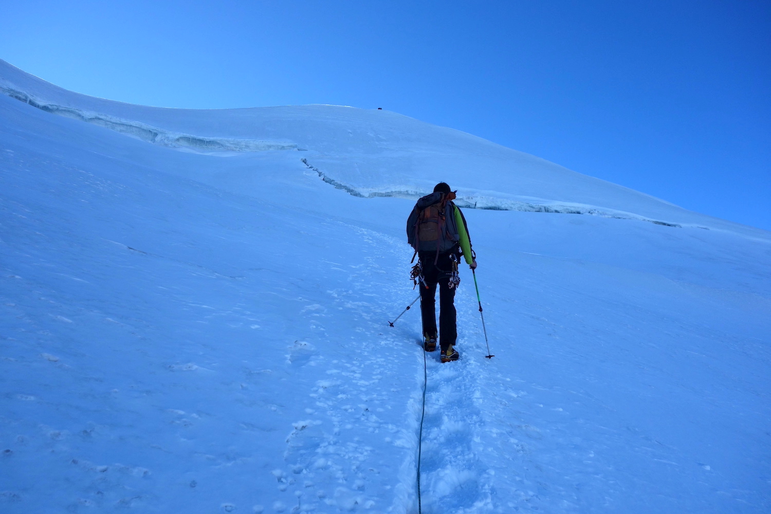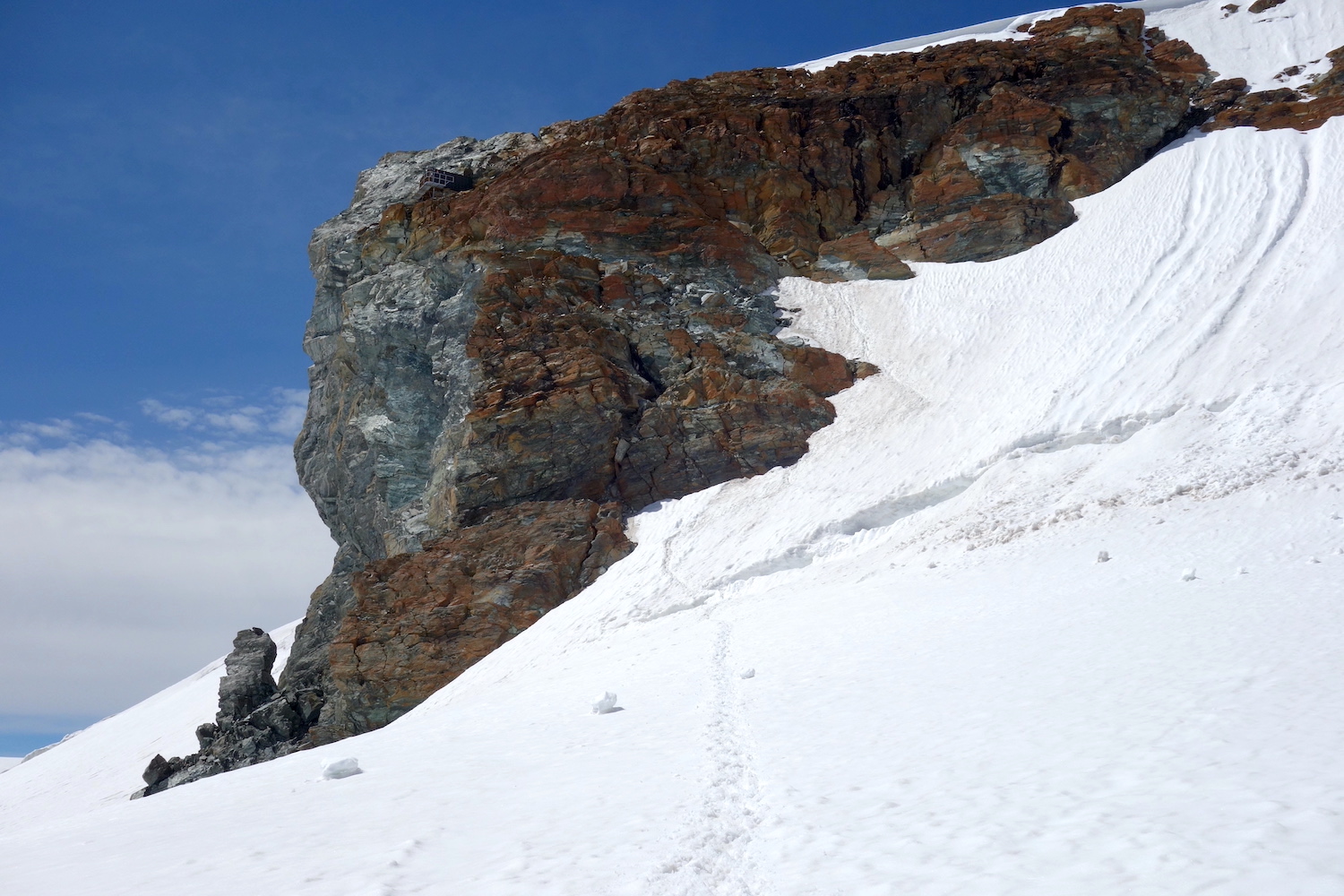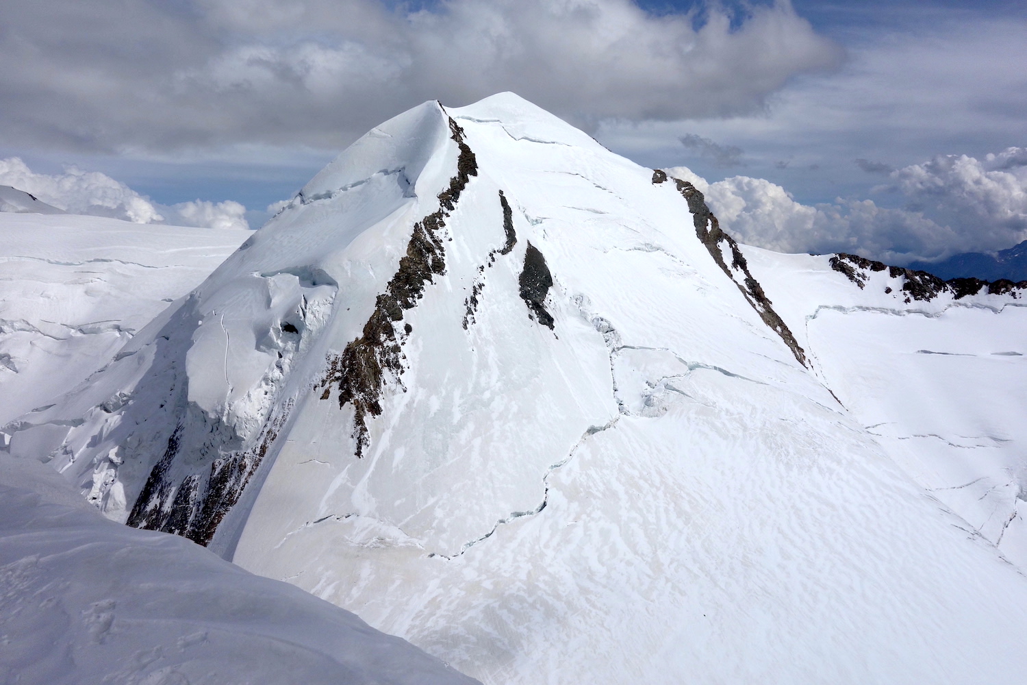 Le Pollux est l’un des plus petits 4000 du Mont Rose. Il est bordé par la chaine des Breithorn au nord-ouest & par le Castor au sud-est. Sa face occidentale, entièrement glaciaire, offre un itinéraire de ski de pente raide. Haute de 200 mètres, elle est inclinée à environ 45 degrés. Son arête sud-ouest elle, constitue la voie la plus fréquentée. Les dalles rocheuses verticales, toutes proches du point culminant, accueillent de nombreuses cordes fixes. Elles donnent ensuite accès au plateau sommital neigeux, décoré d’une statue de vierge. Celui-ci ne comporte aucune difficulté. Un abri non gardé, le bivouac Rossi & Volante, est situé tout proche du Pollux. Construit à 3750 mètres, à flanc de falaises, il permet donc de réaliser divers enchainements.