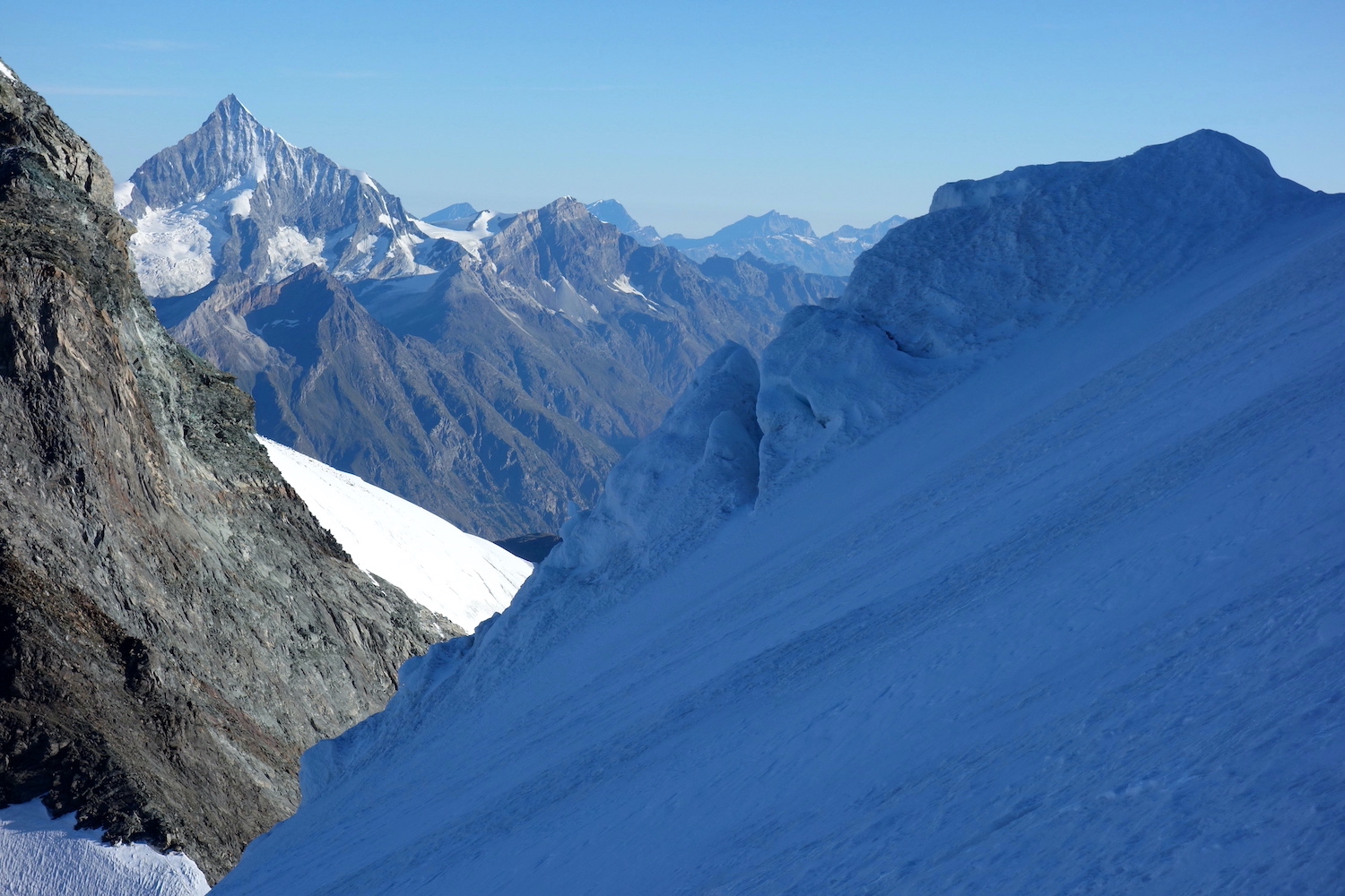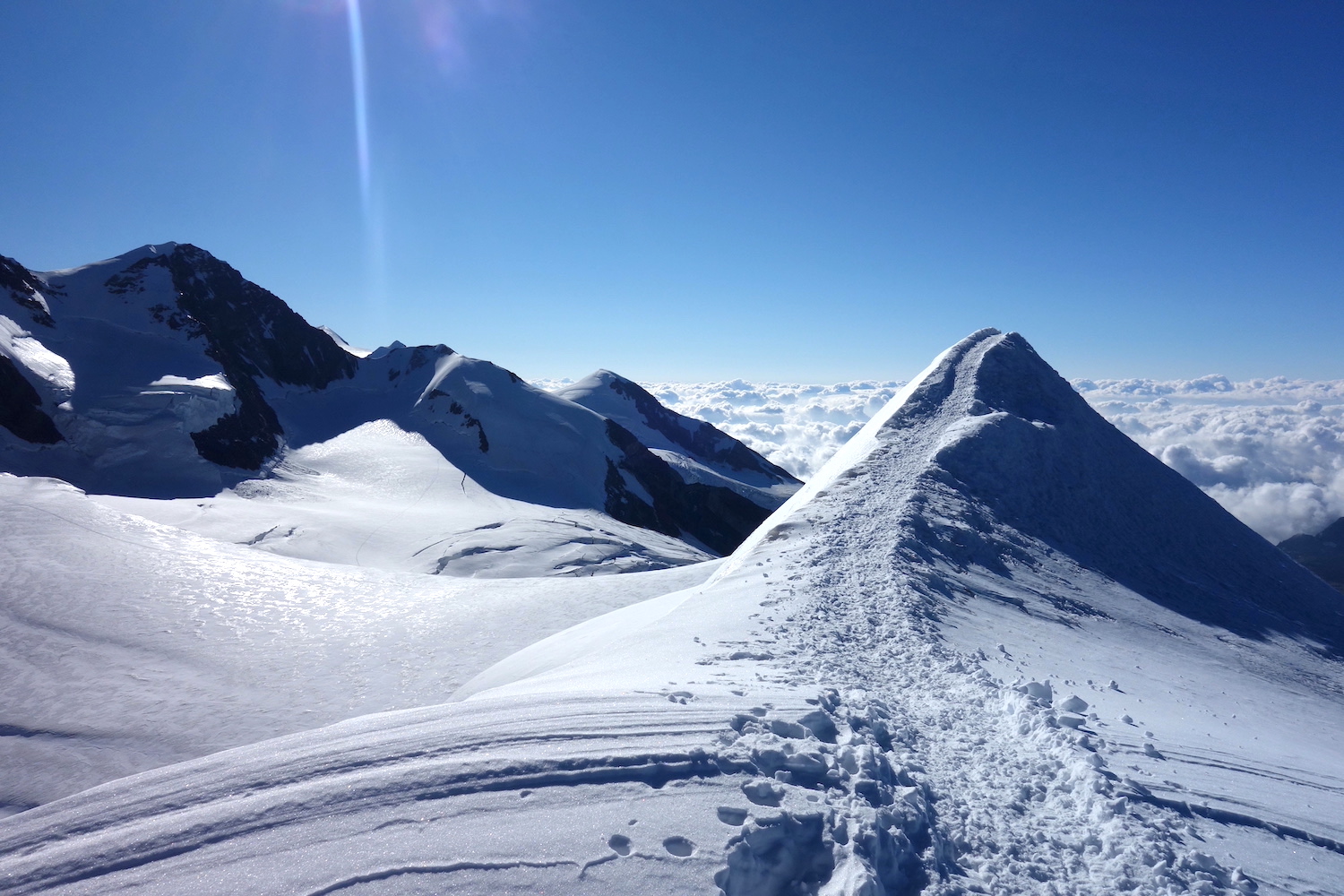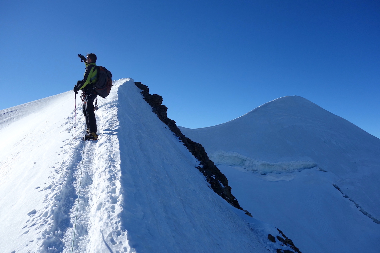 Le Castor est la seconde montagne du Mont Rose à porter le nom d’un Dioscure. Plus haute que son voisin le Pollux, elle est également plus populaire. Les deux reliefs sont séparés l’un de l’autre par le Zwillingsjoch, connu sous le nom de Passo di Verra en italien. Le Castor est moins exigeant sur le plan technique. Durant la Mezzalama (célèbre course de ski-alpinisme), les compétiteurs foulent parfois le point culminant en question, lorsque les conditions nivologiques & météorologiques sont optimales. Son versant nord-ouest est abordable & court à gravir. Entièrement glaciaire, il est souvent découpé par de grosses rimayes, surtout en fin de saison. L’itinéraire aboutit ensuite à une arête neigeuse très effilée, particulièrement photogénique.
