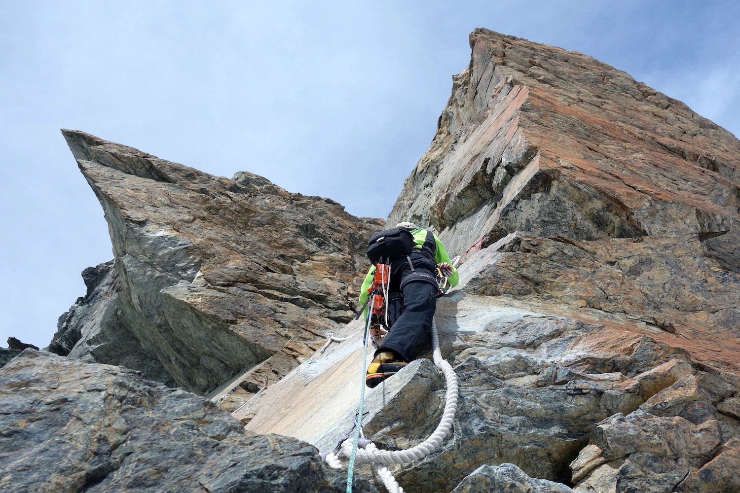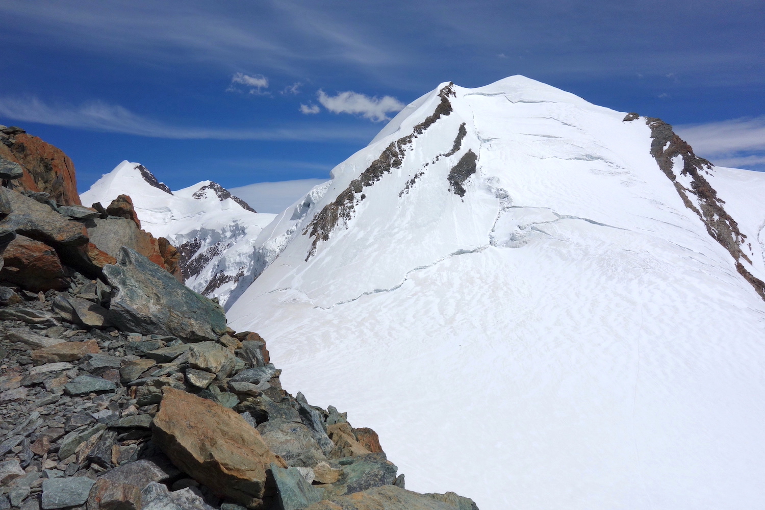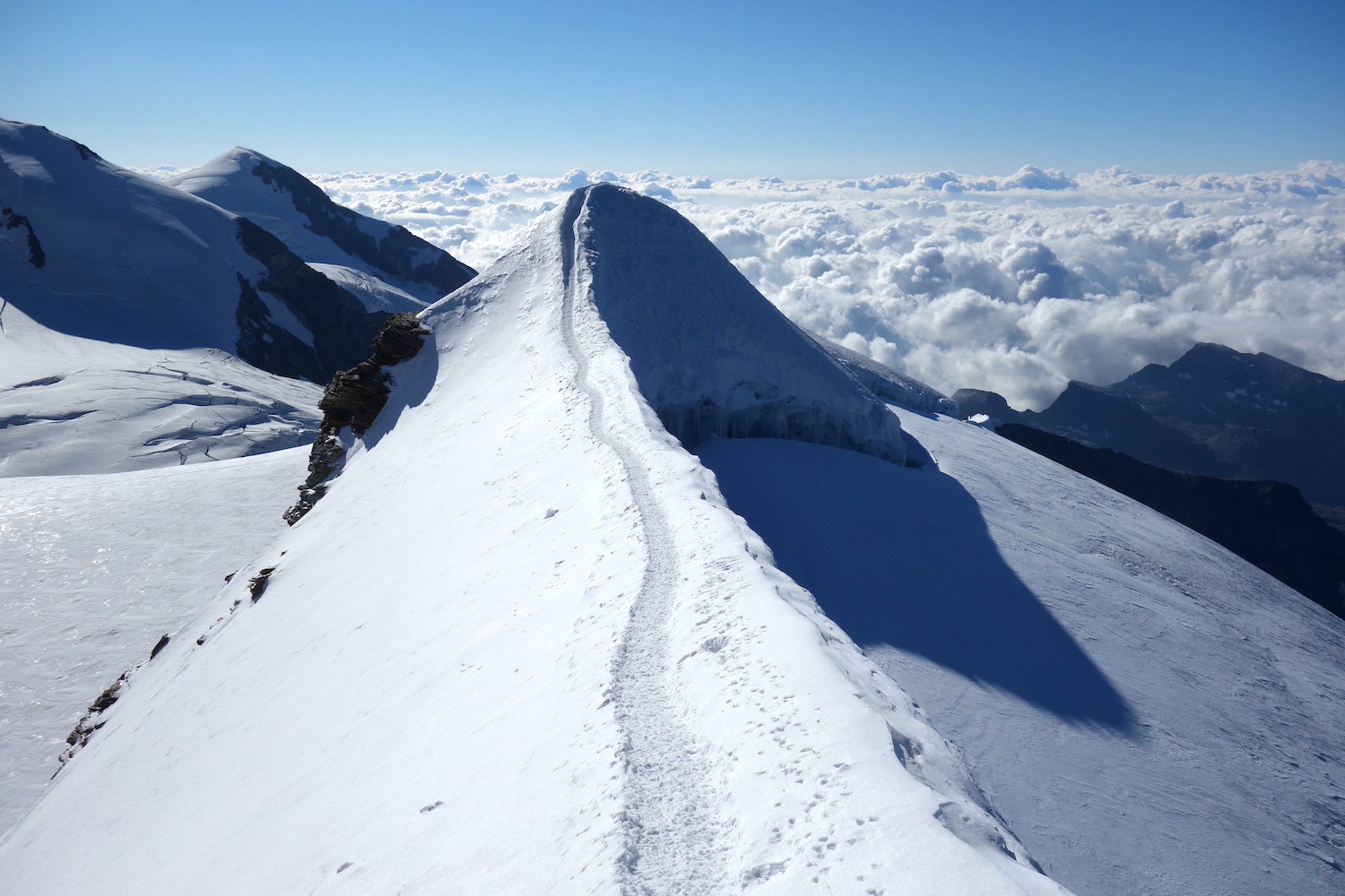 Le Castor est la seconde montagne du Mont Rose à porter le nom d’un Dioscure. Plus haute que son voisin le Pollux, elle est également plus populaire. Les deux reliefs sont séparés l’un de l’autre par le Zwillingsjoch, connu sous le nom de Passo di Verra en italien. Le Castor est moins exigeant sur le plan technique. Durant la Mezzalama (célèbre course de ski-alpinisme), les compétiteurs foulent parfois le point culminant en question, lorsque les conditions nivologiques & météorologiques sont optimales. Son versant nord-ouest est abordable & court à gravir. Entièrement glaciaire, il est souvent découpé par de grosses rimayes, surtout en fin de saison. L’itinéraire aboutit ensuite à une arête neigeuse très effilée, particulièrement photogénique.