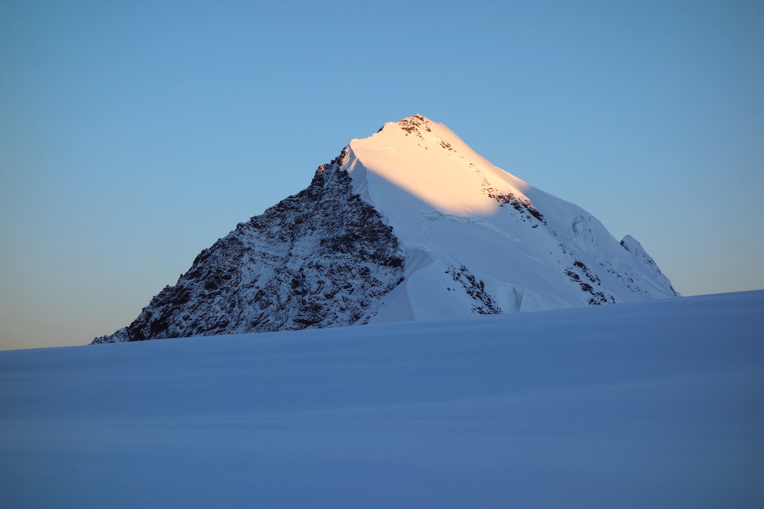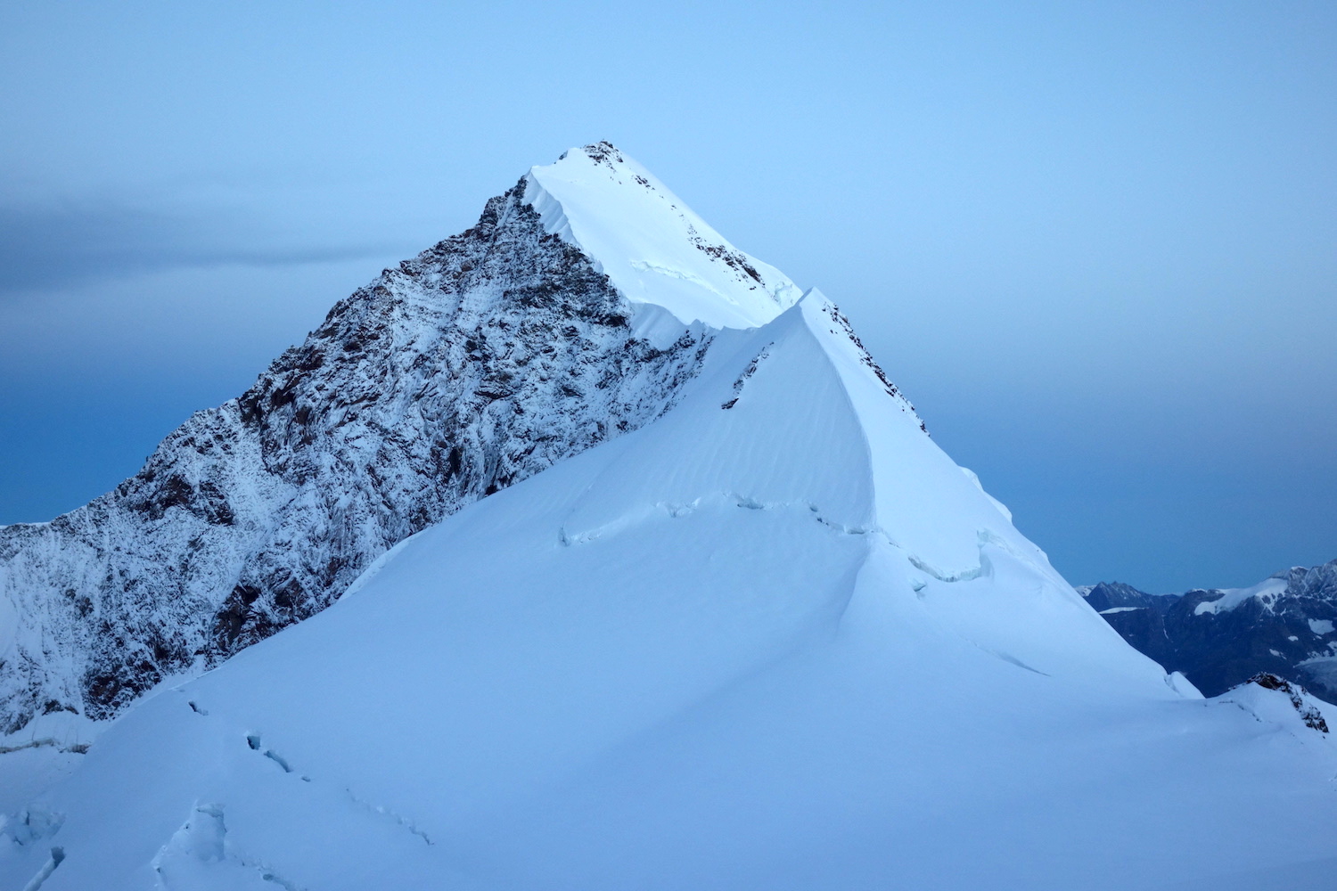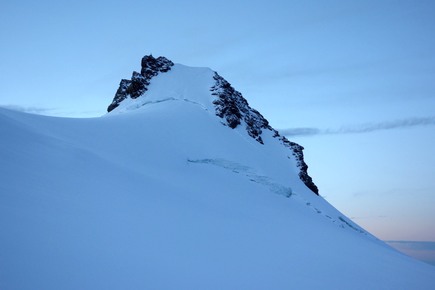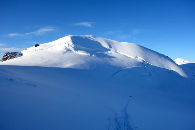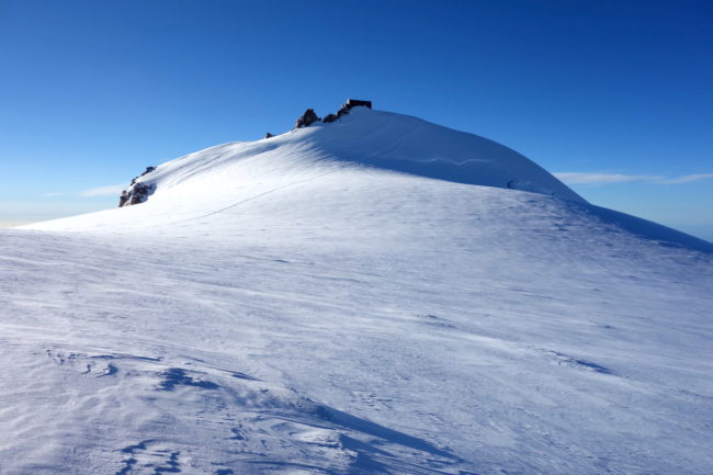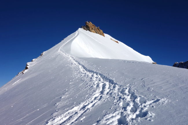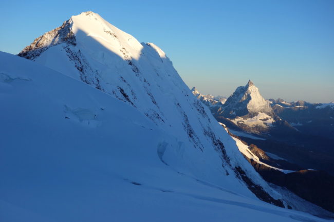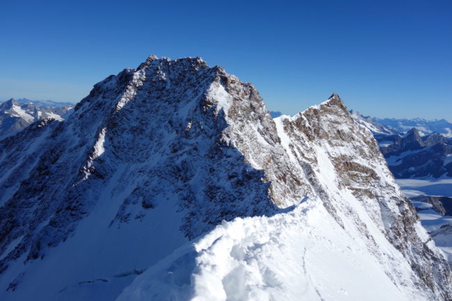 La Parrotspitze est l’un des reliefs les plus proéminents du Mont Rose, trônant à l’ouest de la Signalkuppe. Plus sauvage que les trois monts évoqués précédemment, elle est pourtant plus esthétique sur certains points. Premièrement, sa forme pyramidale vue du nord attire l’œil. Du côté sud, elle apparait comme une paroi rocheuse totalement verticale. Deuxièmement, son ascension s’avère plus intéressante sur le plan technique. En effet, elle offre une magnifique traversée d’arête, pouvant être réalisée dans les deux sens. Peu difficile, le fil neigeux est parfois étroit & nécessite concentration, afin d’éviter un éventuel faux pas. La Parrotspitze doit son nom au célèbre physicien & médecin allemand: Friedrich Parrot, premier vainqueur du Mont Ararat.
