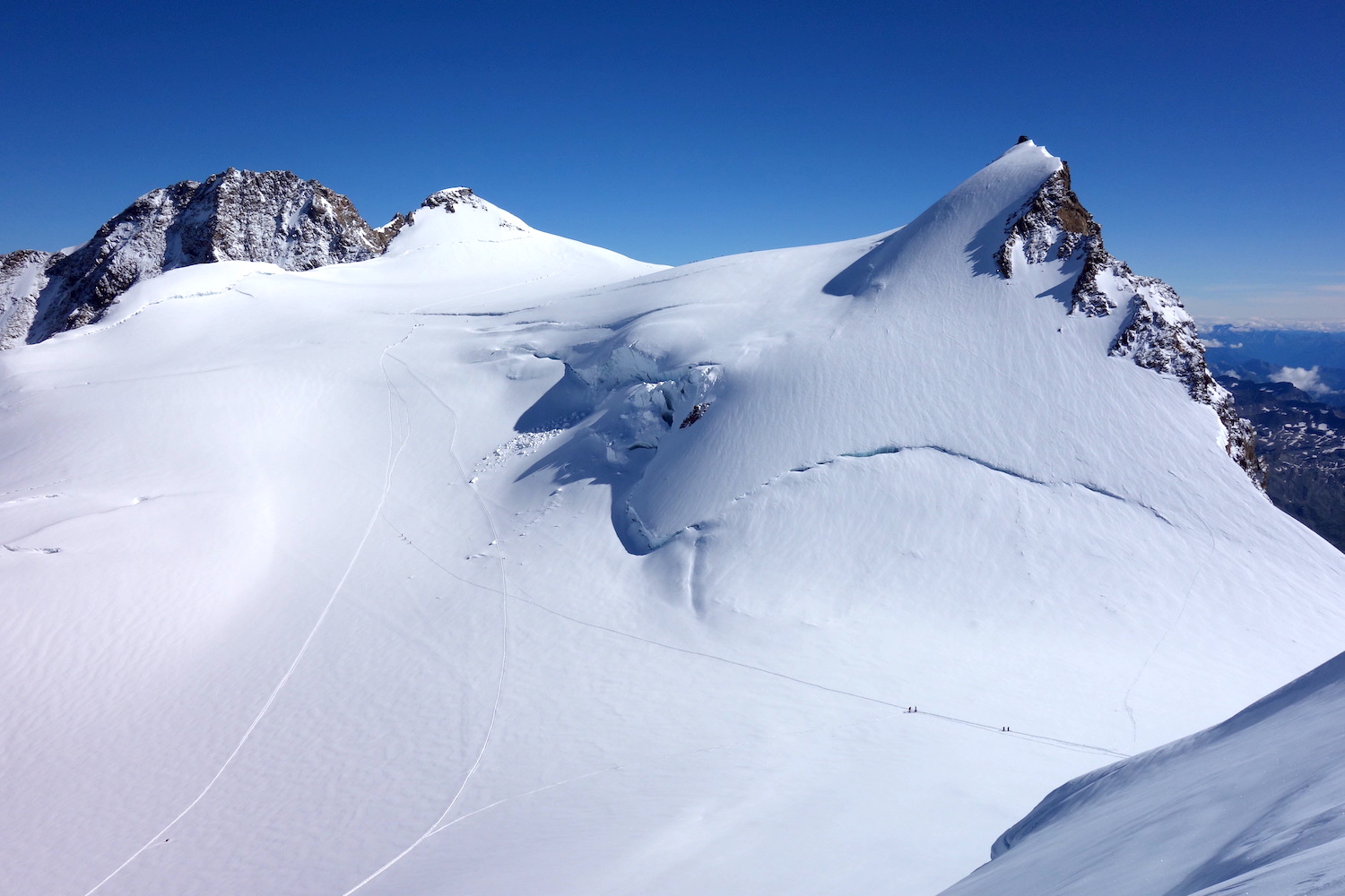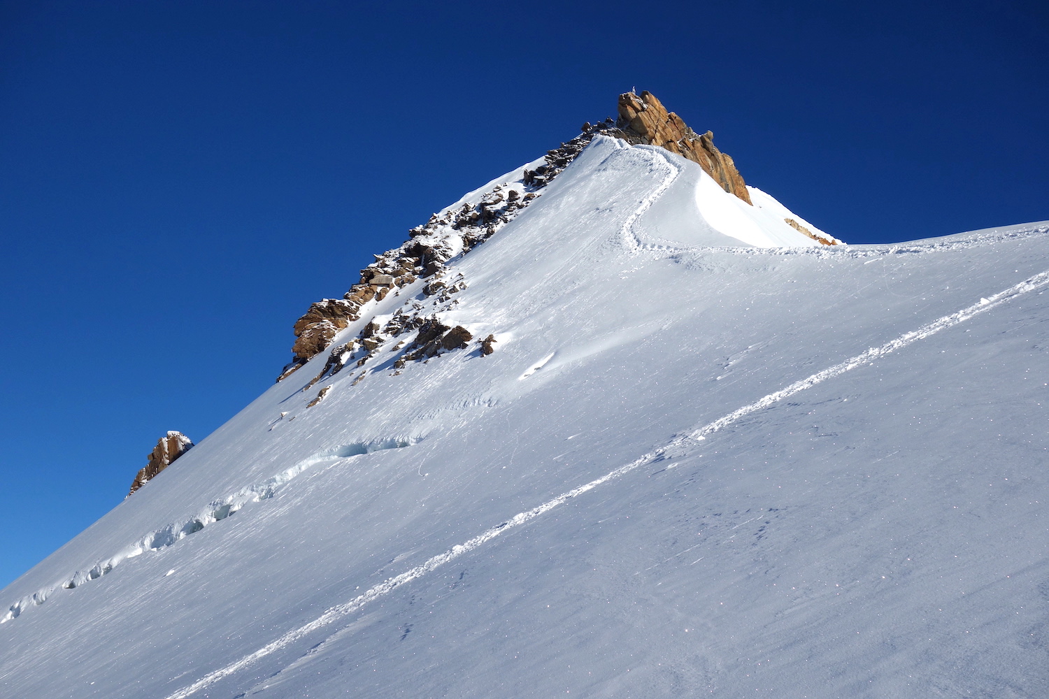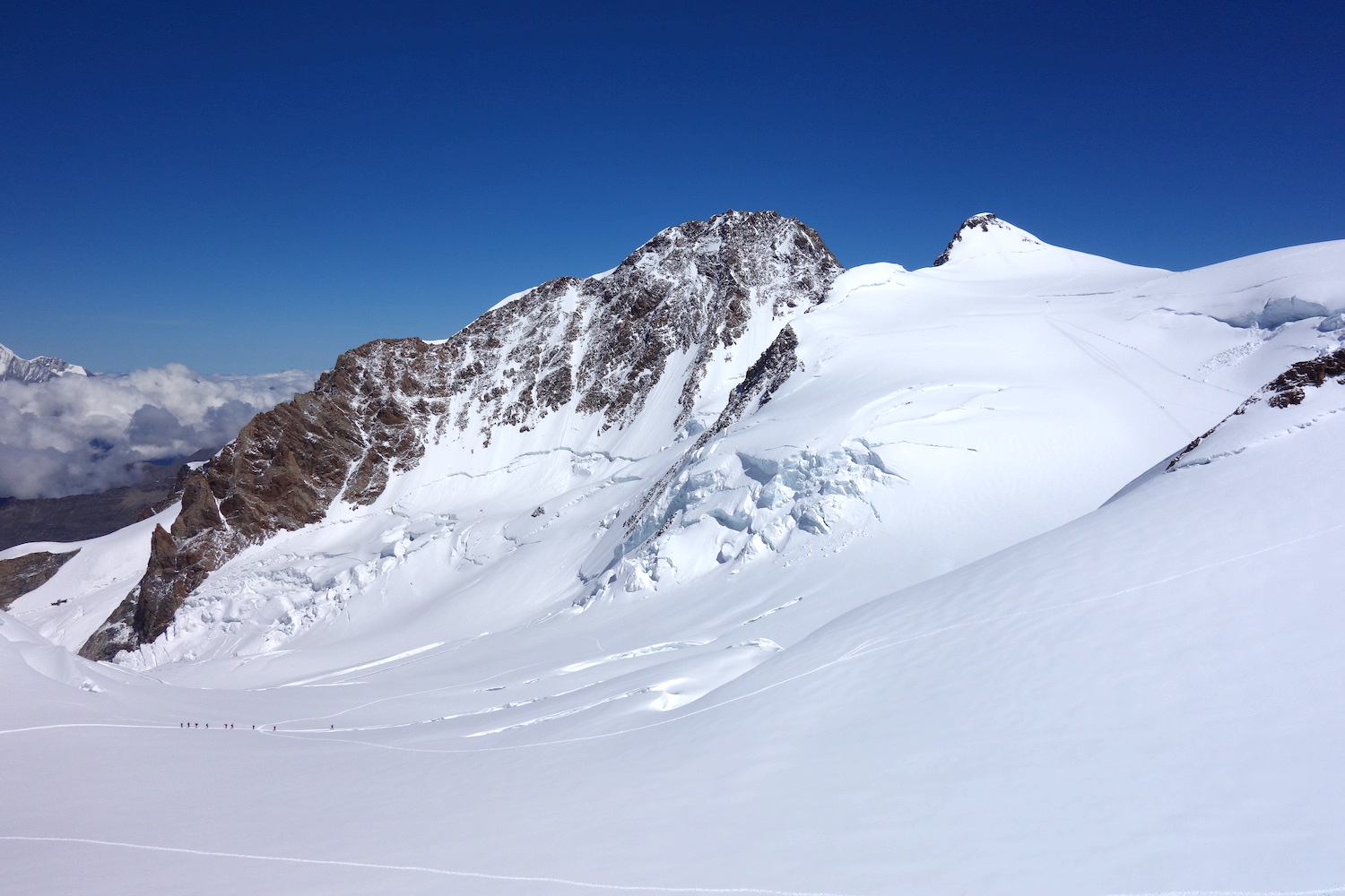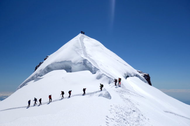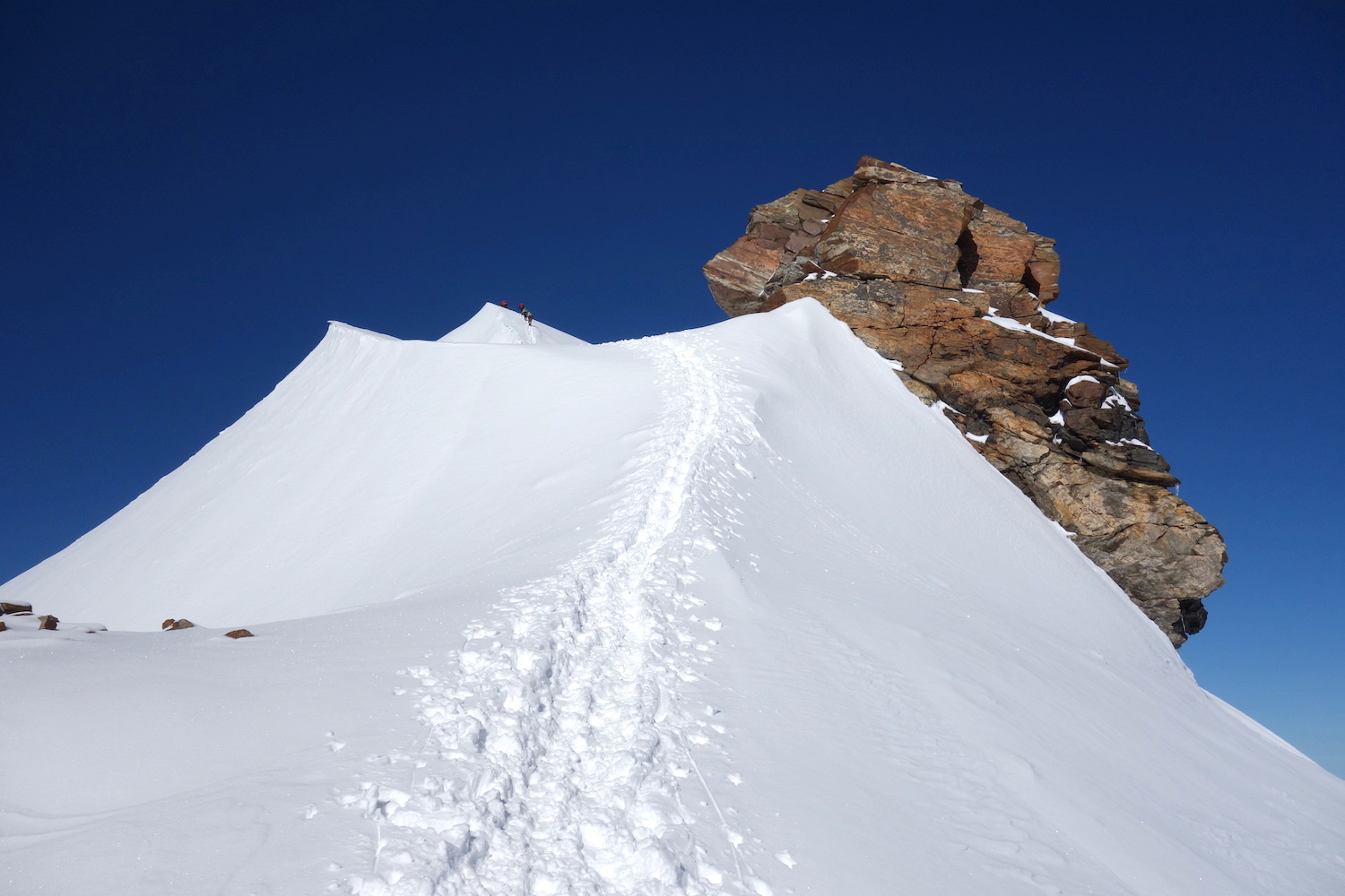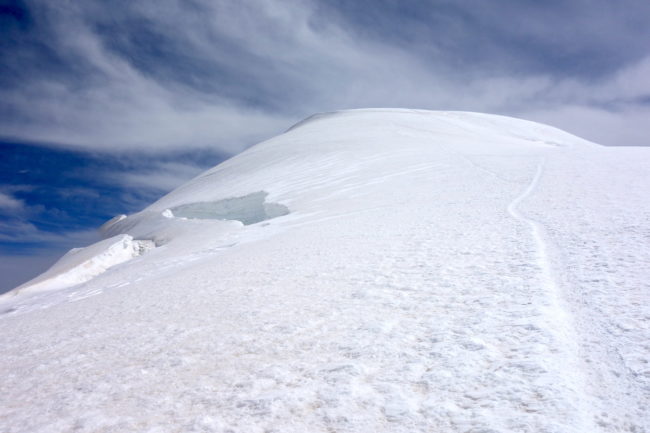 La Parrotspitze est l’un des reliefs les plus proéminents du Mont Rose, trônant à l’ouest de la Signalkuppe. Plus sauvage que les trois monts évoqués précédemment, elle est pourtant plus esthétique sur certains points. Premièrement, sa forme pyramidale vue du nord attire l’œil. Du côté sud, elle apparait comme une paroi rocheuse totalement verticale. Deuxièmement, son ascension s’avère plus intéressante sur le plan technique. En effet, elle offre une magnifique traversée d’arête, pouvant être réalisée dans les deux sens. Peu difficile, le fil neigeux est parfois étroit & nécessite concentration, afin d’éviter un éventuel faux pas. La Parrotspitze doit son nom au célèbre physicien & médecin allemand: Friedrich Parrot, premier vainqueur du Mont Ararat.
