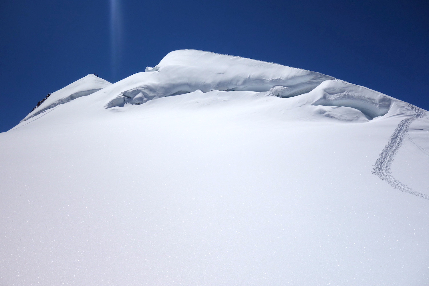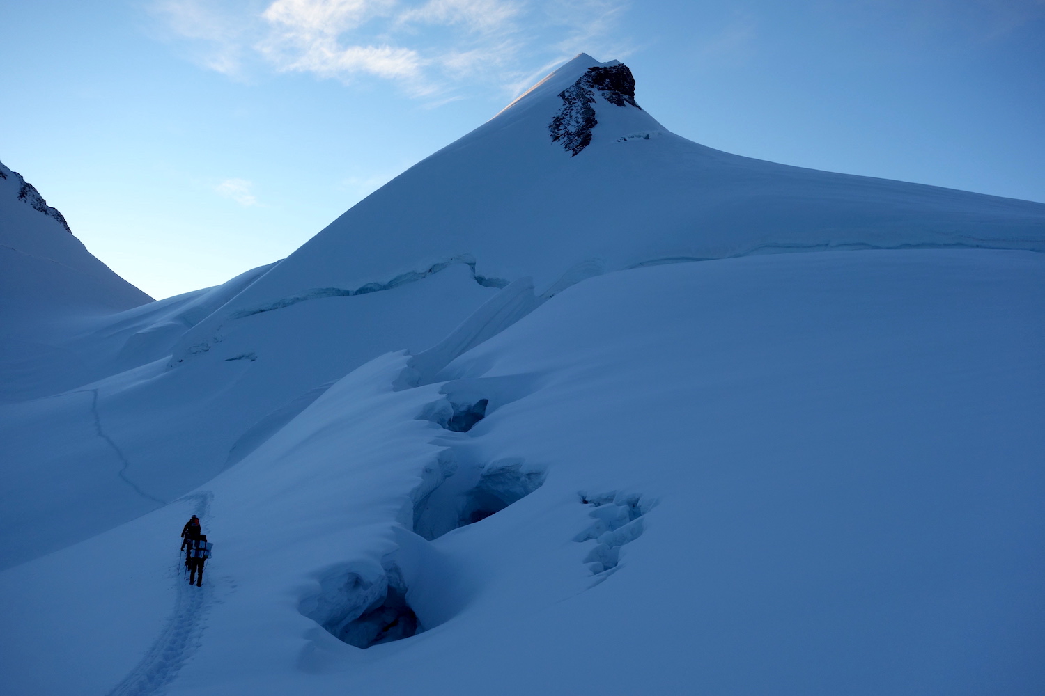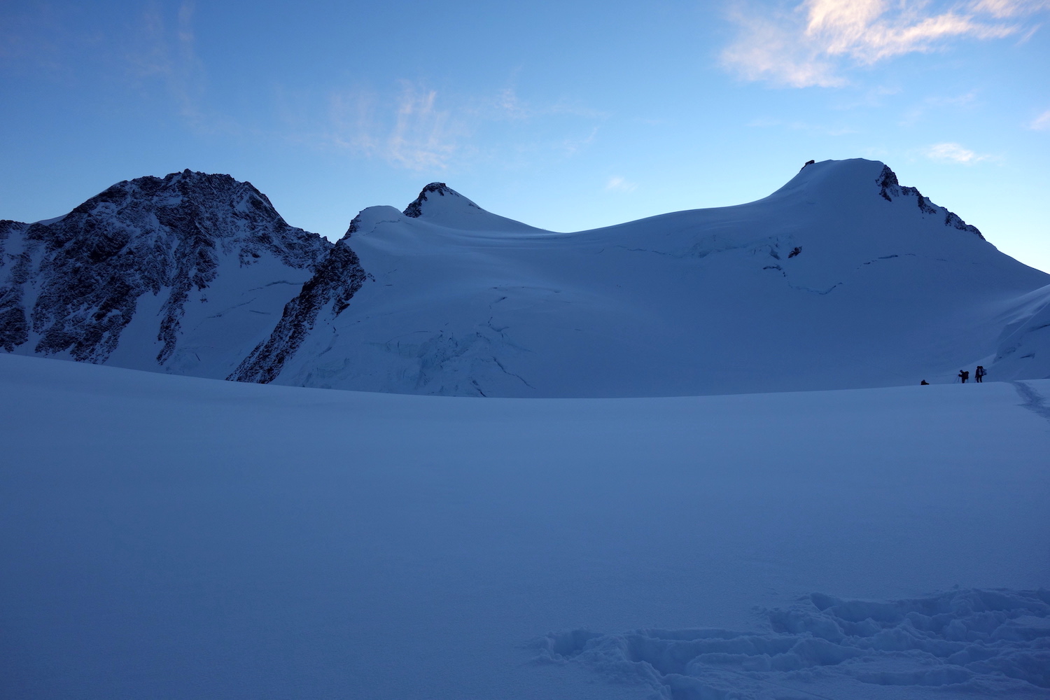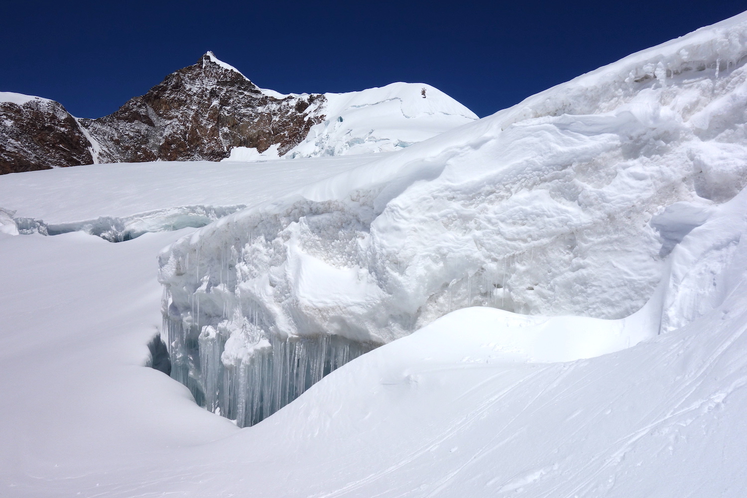 La Parrotspitze est l’un des reliefs les plus proéminents du Mont Rose, trônant à l’ouest de la Signalkuppe. Plus sauvage que les trois monts évoqués précédemment, elle est pourtant plus esthétique sur certains points. Premièrement, sa forme pyramidale vue du nord attire l’œil. Du côté sud, elle apparait comme une paroi rocheuse totalement verticale. Deuxièmement, son ascension s’avère plus intéressante sur le plan technique. En effet, elle offre une magnifique traversée d’arête, pouvant être réalisée dans les deux sens. Peu difficile, le fil neigeux est parfois étroit & nécessite concentration, afin d’éviter un éventuel faux pas. La Parrotspitze doit son nom au célèbre physicien & médecin allemand: Friedrich Parrot, premier vainqueur du Mont Ararat.