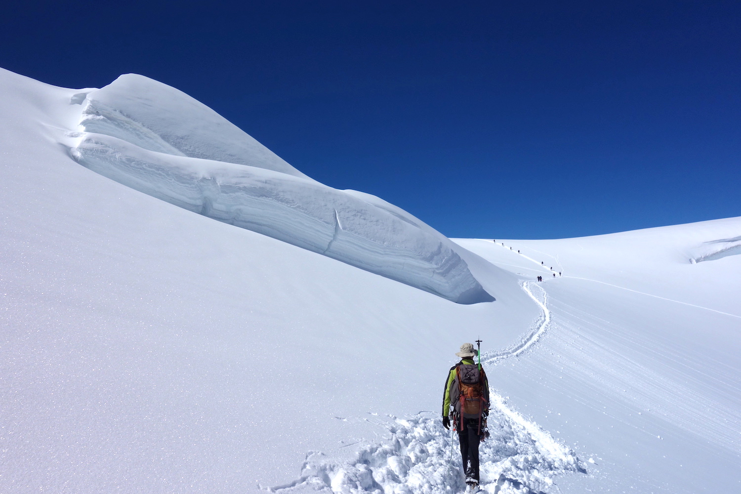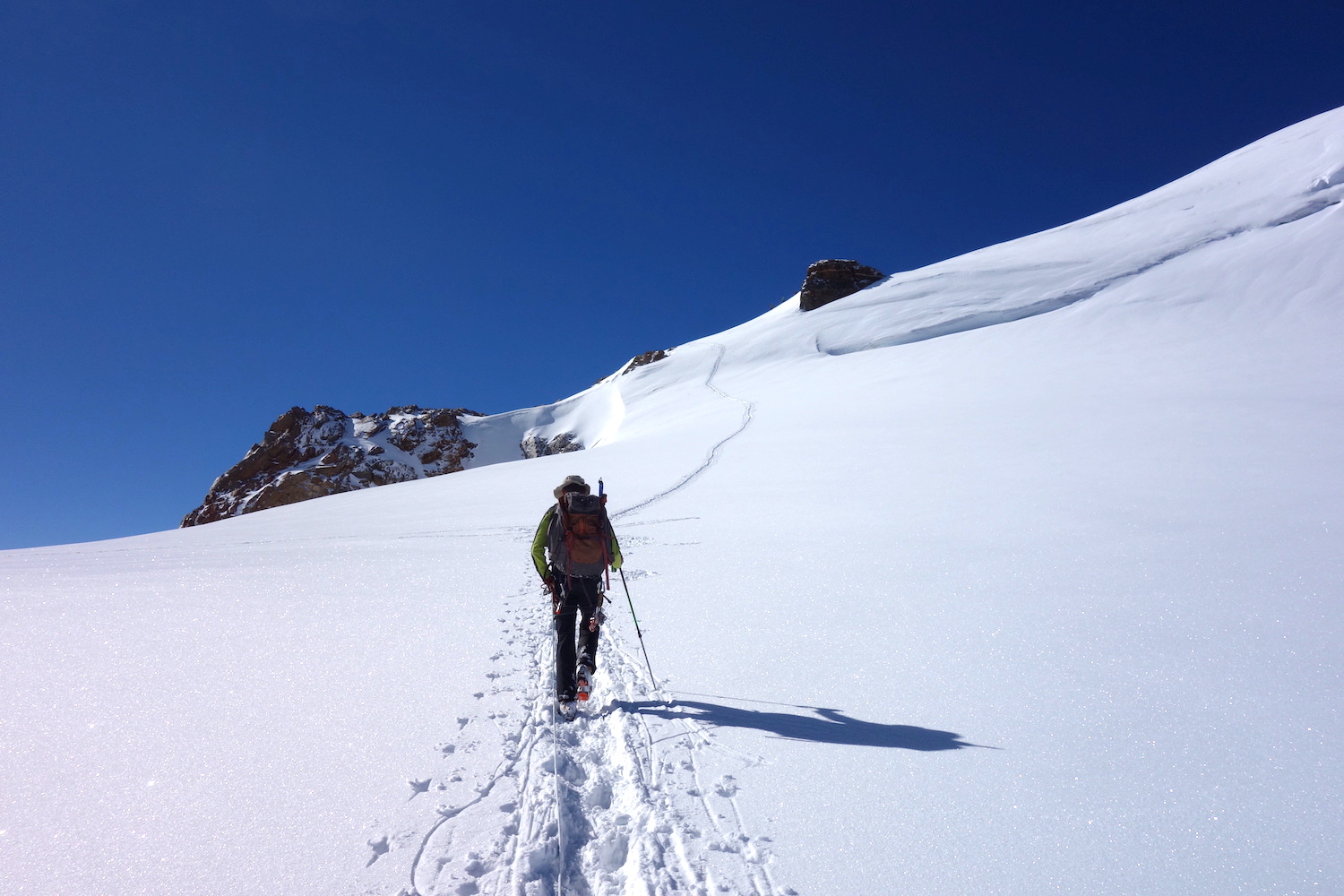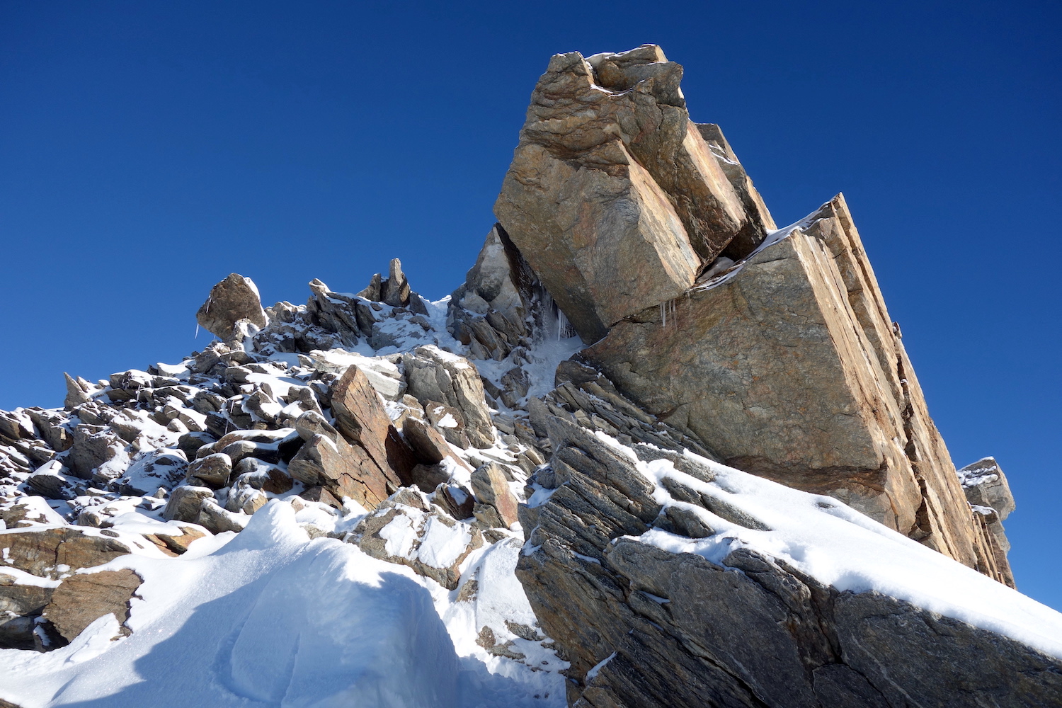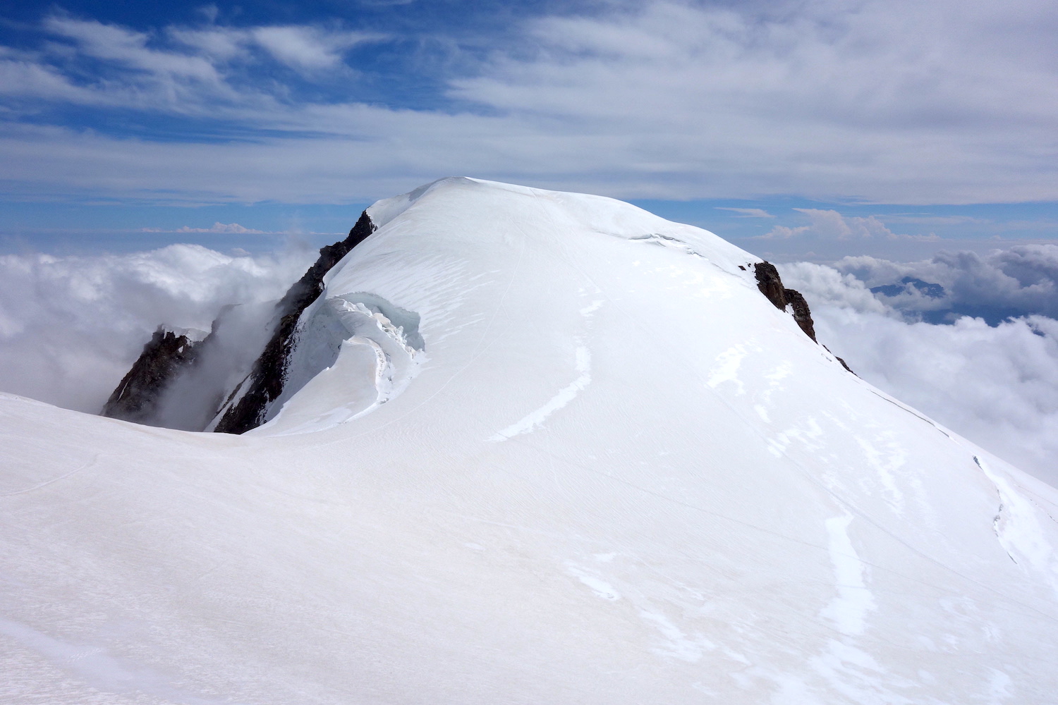 La Parrotspitze est l’un des reliefs les plus proéminents du Mont Rose, trônant à l’ouest de la Signalkuppe. Plus sauvage que les trois monts évoqués précédemment, elle est pourtant plus esthétique sur certains points. Premièrement, sa forme pyramidale vue du nord attire l’œil. Du côté sud, elle apparait comme une paroi rocheuse totalement verticale. Deuxièmement, son ascension s’avère plus intéressante sur le plan technique. En effet, elle offre une magnifique traversée d’arête, pouvant être réalisée dans les deux sens. Peu difficile, le fil neigeux est parfois étroit & nécessite concentration, afin d’éviter un éventuel faux pas. La Parrotspitze doit son nom au célèbre physicien & médecin allemand: Friedrich Parrot, premier vainqueur du Mont Ararat.