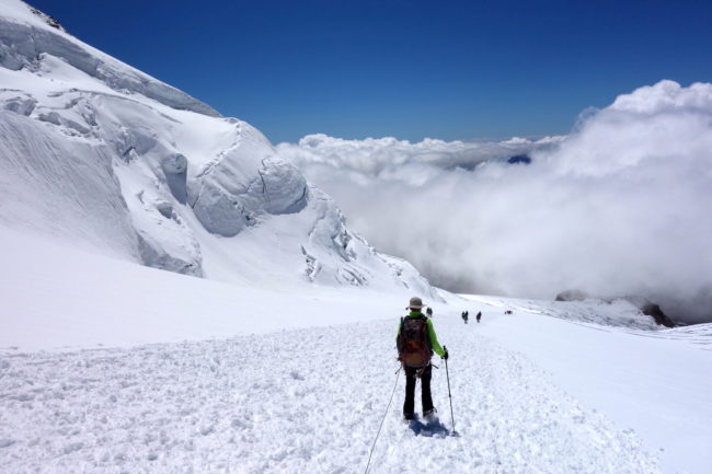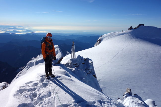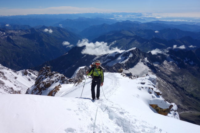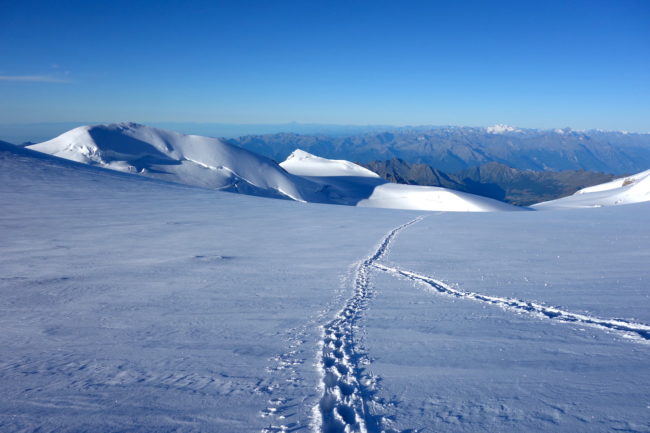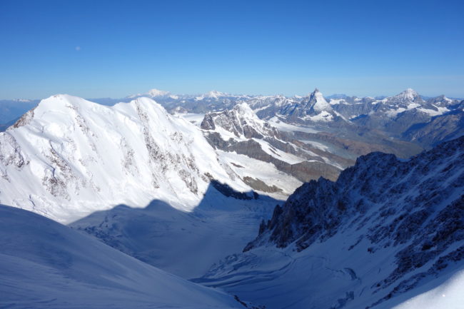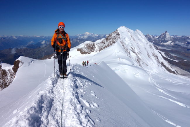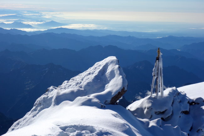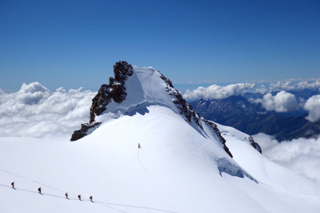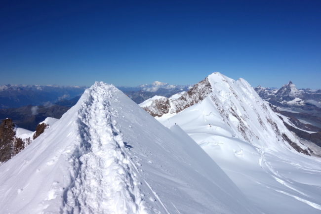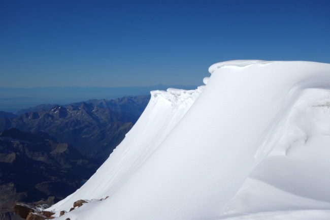 La Zumsteinspitze est le cinquième plus haut sommet des Alpes. Il constitue également le troisième plus grand relief du Mont Rose, culminant à la Dufourspitze, toit de la Suisse. Notre montagne en est d’ailleurs reliée par son arête nord-ouest, réputée pour être une course technique d’alpinisme. L’itinéraire classique de la Zumsteinspitze n’est qu’une affaire de randonnée glaciaire. Son final se déroule sur sa crête sud-est, présentant de brefs passages escarpés. Au plus haut point se trouve une petite statue de vierge. Sa position géographique privilégiée en fait sûrement l’un des plus beaux belvédères du coin. La Zumsteinspitze est le point culminant du Spaghetti Tour, enchainement constituant à gravir les cimes accessibles du Mont Rose.