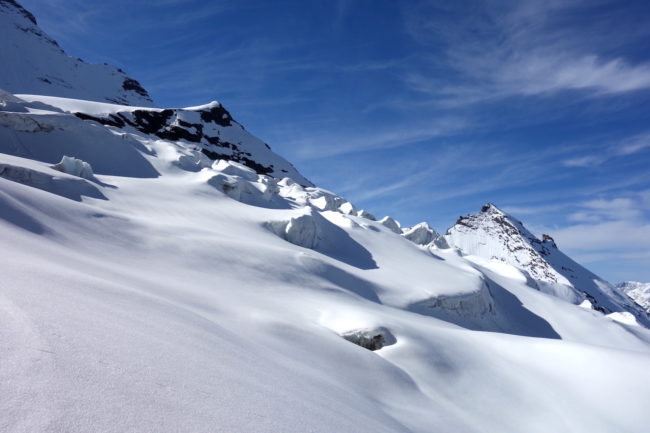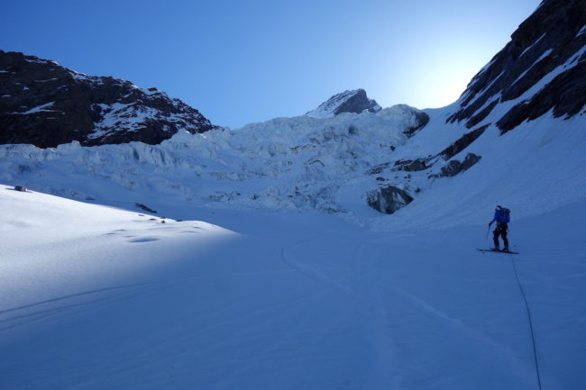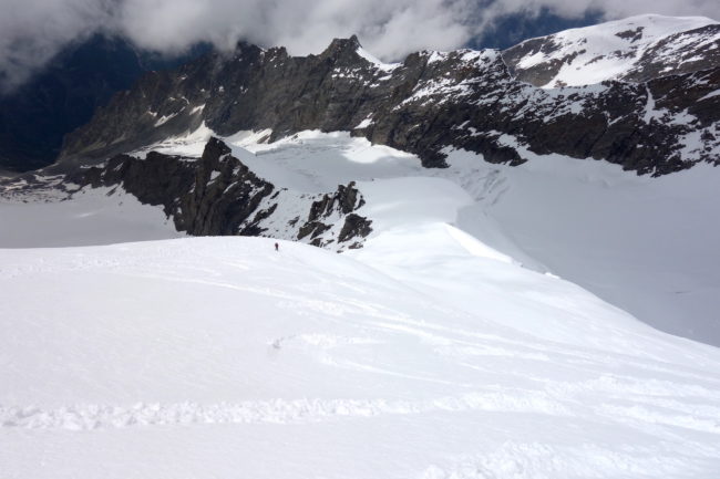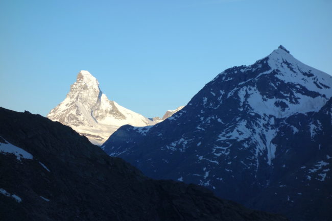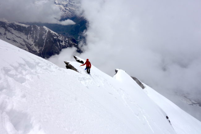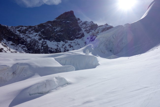 Le Täschhorn, avec ses 4491 mètres d’altitude, constitue le dixième plus haut sommet des Alpes. Appartenant à l’immense massif des Alpes Pennines, il trône entre le Mattertal à l’ouest & le Saastal à l’est. La montagne est dominée de près par le célèbre Dom des Mischabels, plus haute cime entièrement située en territoire suisse. Tous les itinéraires menant au Täschhorn sont longs & possèdent des difficultés techniques notables. Ainsi, il est rendu sauvage & exigent. En périodes estivales, l’arête méridionale est l’une des voies les plus prisées. Un abri non gardé est construit à son pied: le Mischabeljochbiwak, perché à 3855 mètres. La face nord-ouest est considérée comme la voie normale du géant. Elle démarre du hameau de Randa, puis passe par la Kinhütte. S’en suit le Kingletscher, zone glaciaire tourmentée puis le versant mentionné. Lorsque les conditions de neige sont bonnes, celle-ci devient une ligne de ski de pente raide.
