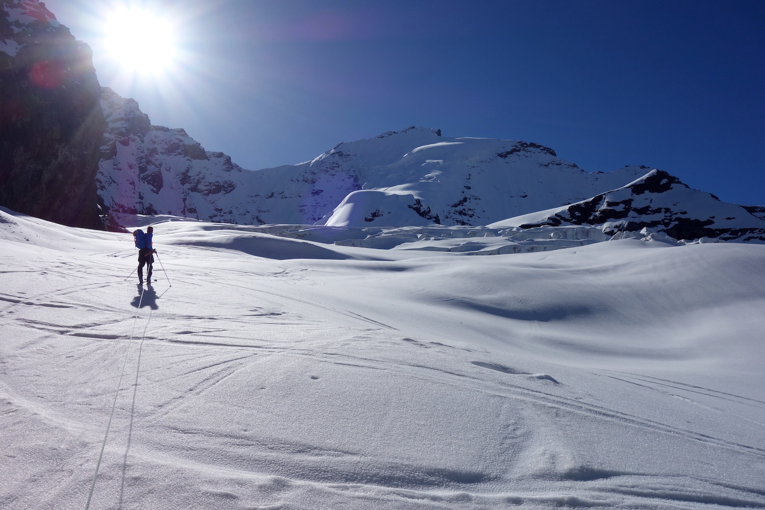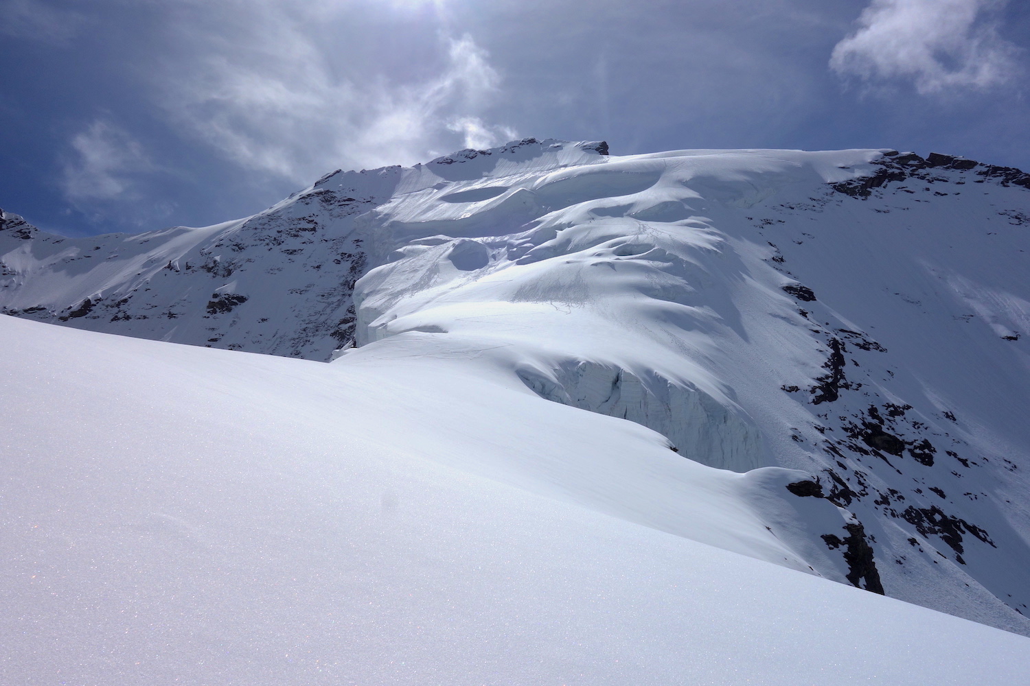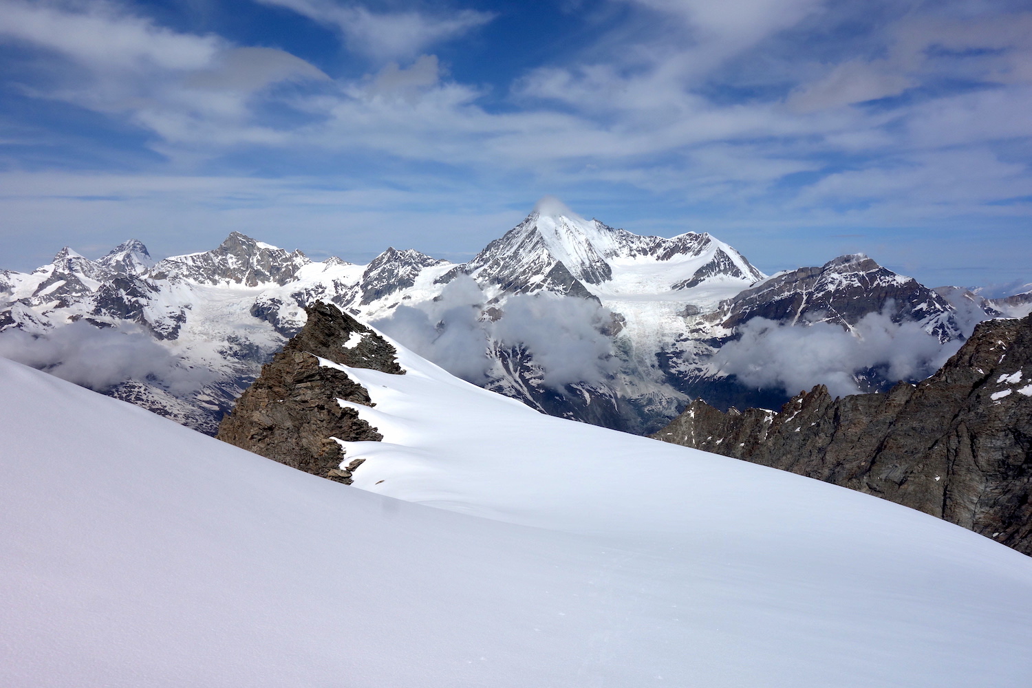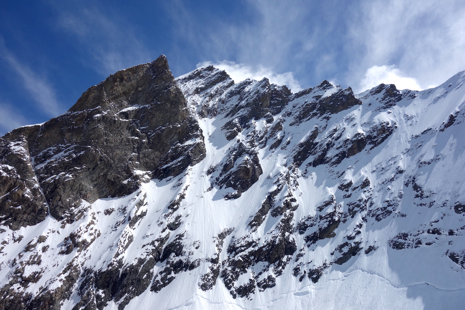 Le Täschhorn, avec ses 4491 mètres d’altitude, constitue le dixième plus haut sommet des Alpes. Appartenant à l’immense massif des Alpes Pennines, il trône entre le Mattertal à l’ouest & le Saastal à l’est. La montagne est dominée de près par le célèbre Dom des Mischabels, plus haute cime entièrement située en territoire suisse. Tous les itinéraires menant au Täschhorn sont longs & possèdent des difficultés techniques notables. Ainsi, il est rendu sauvage & exigent. En périodes estivales, l’arête méridionale est l’une des voies les plus prisées. Un abri non gardé est construit à son pied: le Mischabeljochbiwak, perché à 3855 mètres. La face nord-ouest est considérée comme la voie normale du géant. Elle démarre du hameau de Randa, puis passe par la Kinhütte. S’en suit le Kingletscher, zone glaciaire tourmentée puis le versant mentionné. Lorsque les conditions de neige sont bonnes, celle-ci devient une ligne de ski de pente raide.