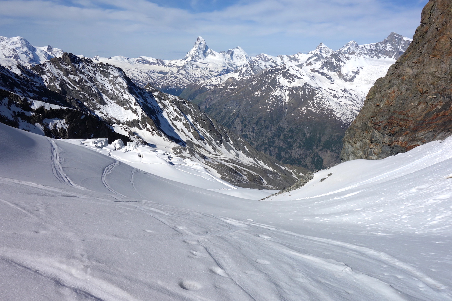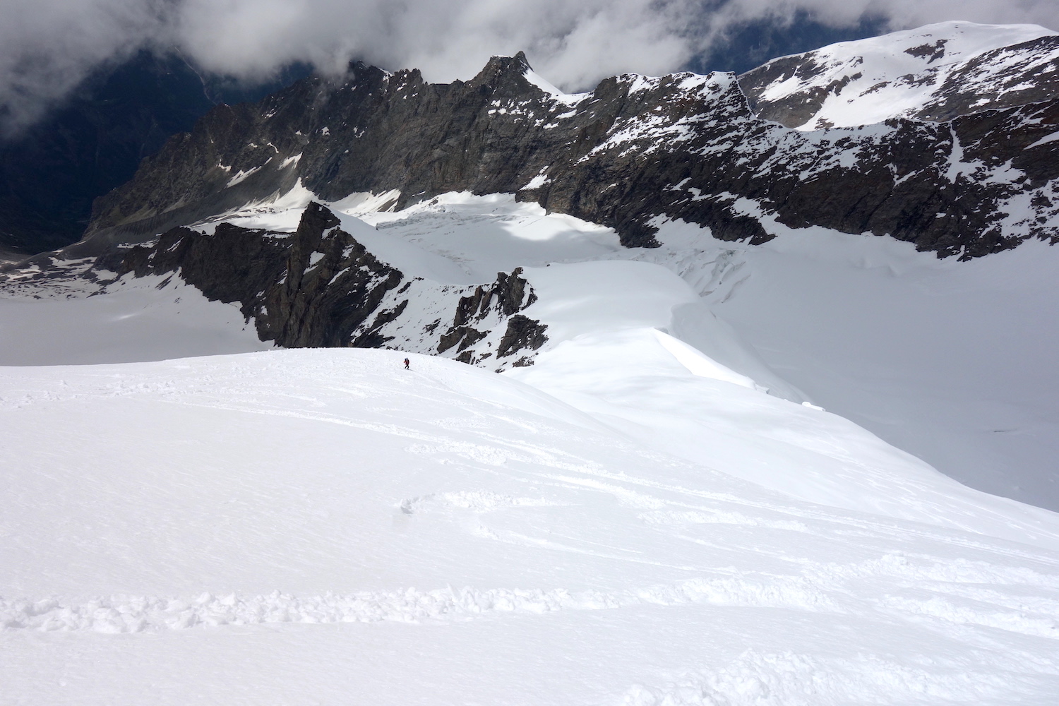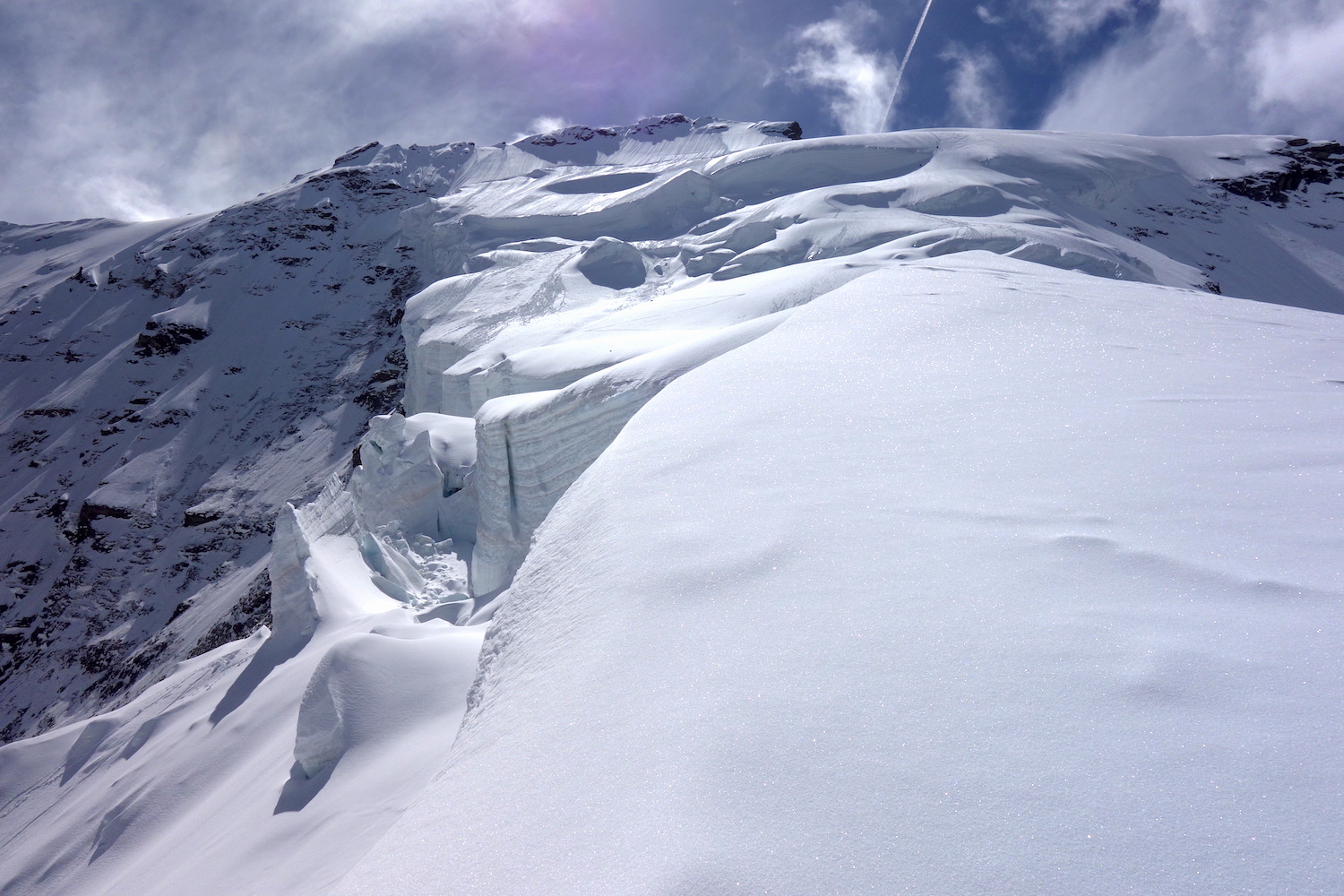 Le Täschhorn, avec ses 4491 mètres d’altitude, constitue le dixième plus haut sommet des Alpes. Appartenant à l’immense massif des Alpes Pennines, il trône entre le Mattertal à l’ouest & le Saastal à l’est. La montagne est dominée de près par le célèbre Dom des Mischabels, plus haute cime entièrement située en territoire suisse. Tous les itinéraires menant au Täschhorn sont longs & possèdent des difficultés techniques notables. Ainsi, il est rendu sauvage & exigent. En périodes estivales, l’arête méridionale est l’une des voies les plus prisées. Un abri non gardé est construit à son pied: le Mischabeljochbiwak, perché à 3855 mètres. La face nord-ouest est considérée comme la voie normale du géant. Elle démarre du hameau de Randa, puis passe par la Kinhütte. S’en suit le Kingletscher, zone glaciaire tourmentée puis le versant mentionné. Lorsque les conditions de neige sont bonnes, celle-ci devient une ligne de ski de pente raide.